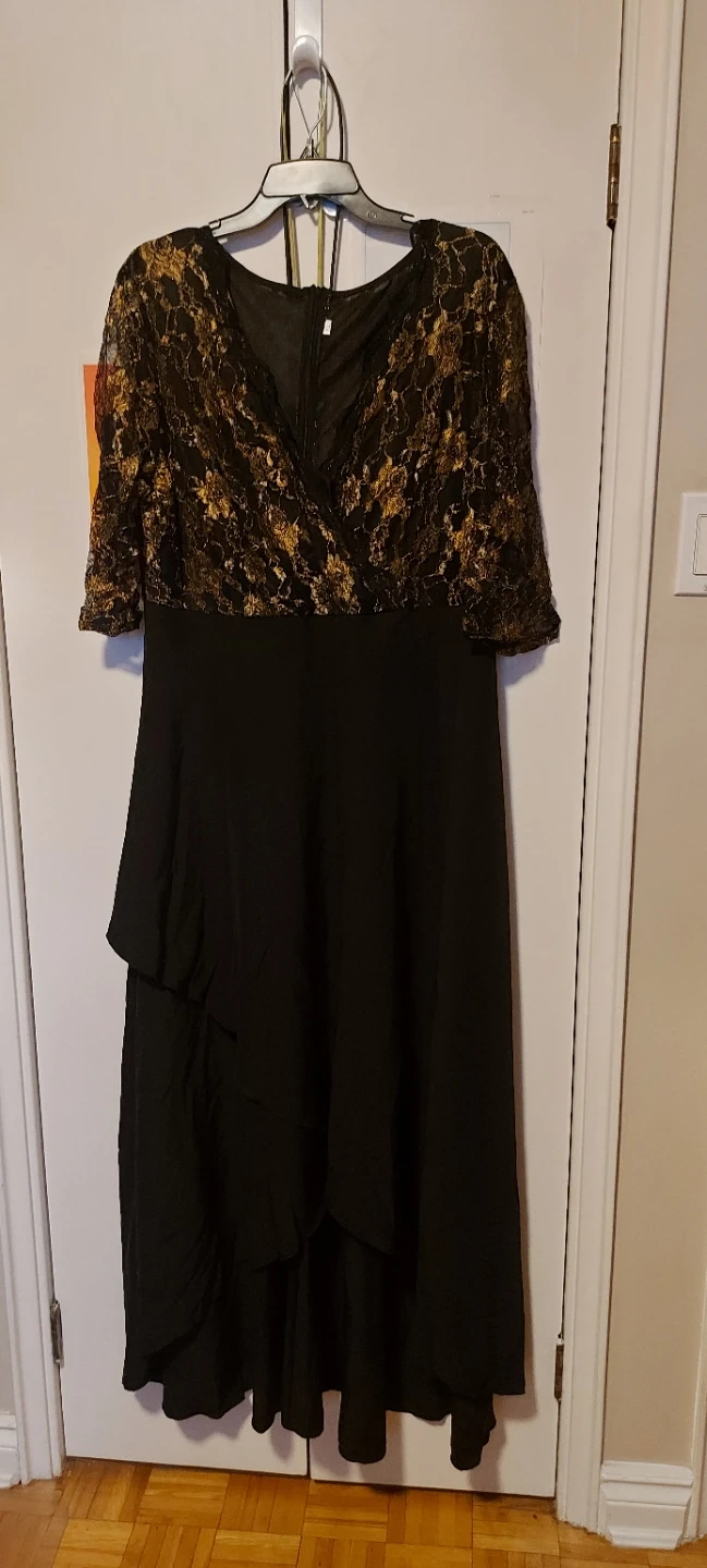 Selling a beautiful black dress with gold lace detailing on the upper portion! It's in great condition and would be perfect for a special occasion or evening out. Dress length is Shorter in front, longer in back