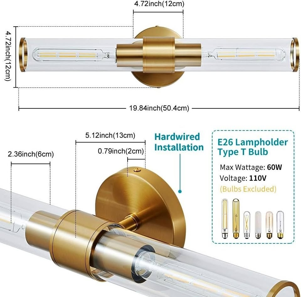 Modern style design: The simple and advanced appearance of the gold wall sconce is perfectly matched with any decoration style, will bring more comfort and beauty to the lighting of your home Sturdy and durable: Gold bathroom light fixtures is made of sturdy metal frame with gold finish and high quality clear glass, making the vanity light durable, rust and oxidation resistant Dimensions: Bathroom lights over mirror overall: 19.84" x 4.72" x 4.72" (L x W x H), back plate:4.72" diameter. 110-120V AC hardwired. All mounting hardware and instructions are included to help make your installation faster and easier E26 Bulbs: Bathroom vanity light with E26 base, type T-bulb recommended, 60W max; fully dimmable when using dimmable bulbs and compatible dimmer switch (Bulb and dimmer switch excluded)