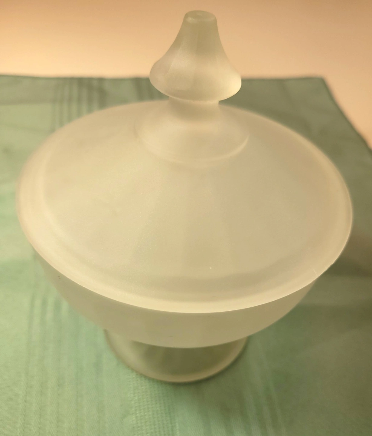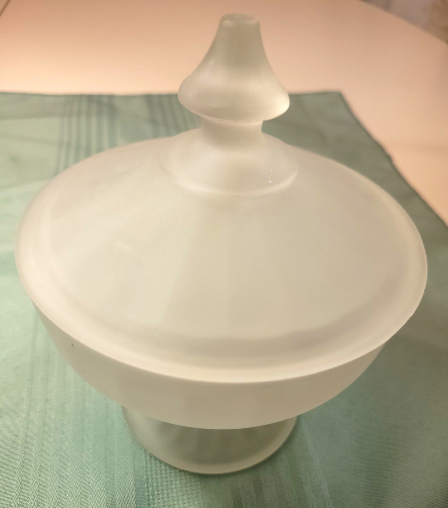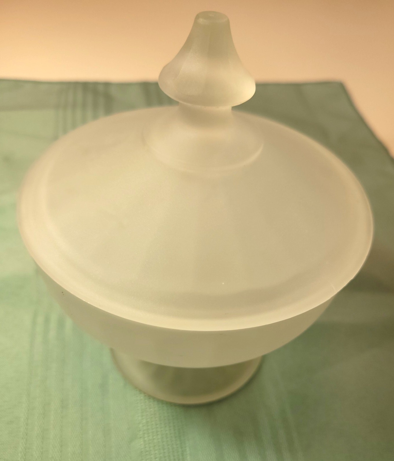 This elegant candy dish features a classic "Satin" frosted finish, a pedestal footed base, and a matching lid with a decorative finial.