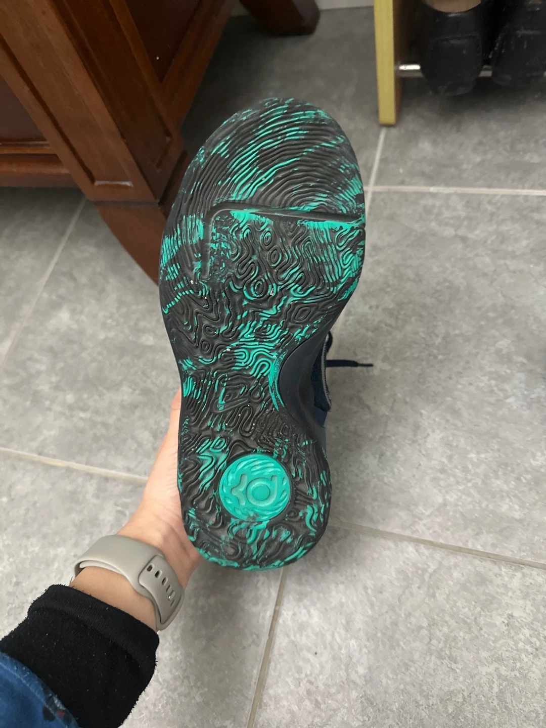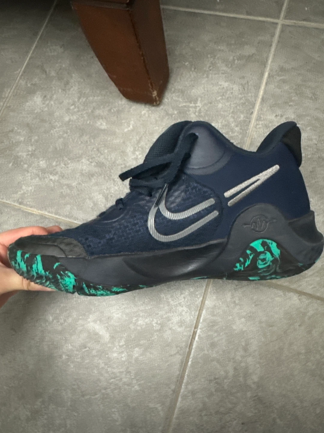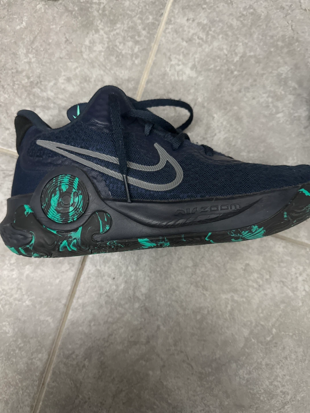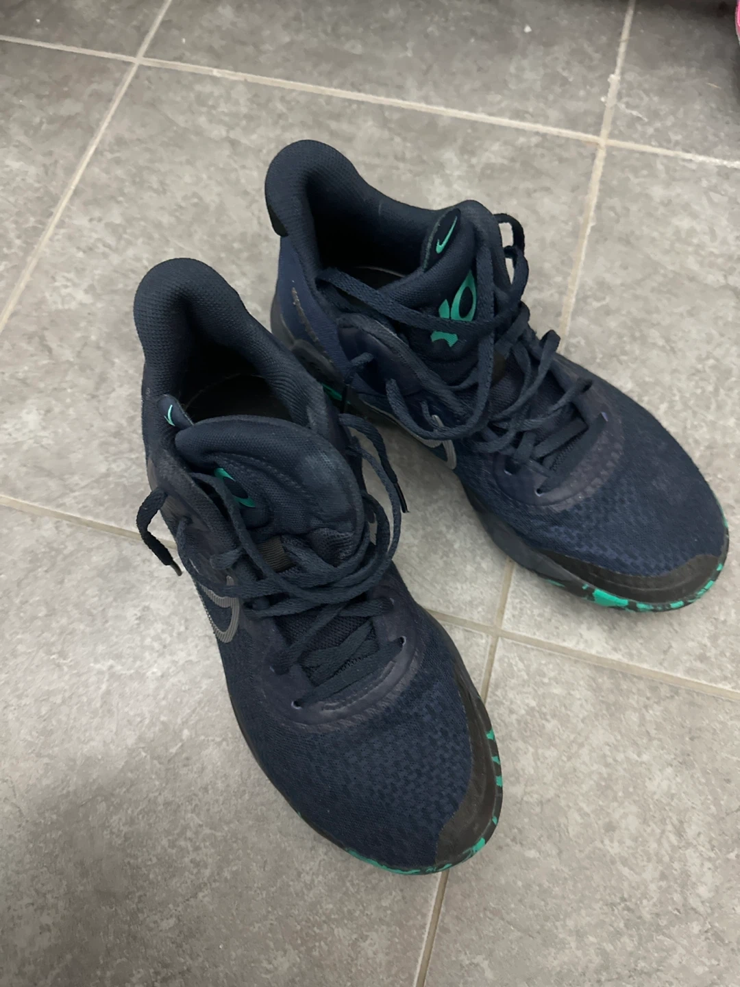 Selling a pair of Nike KD Trey 5 IX basketball shoes in US size 7. These shoes feature a stylish navy blue colour with a unique green pattern on the sole and accents. The model number is CW3400-400. Great for basketball or casual wear!