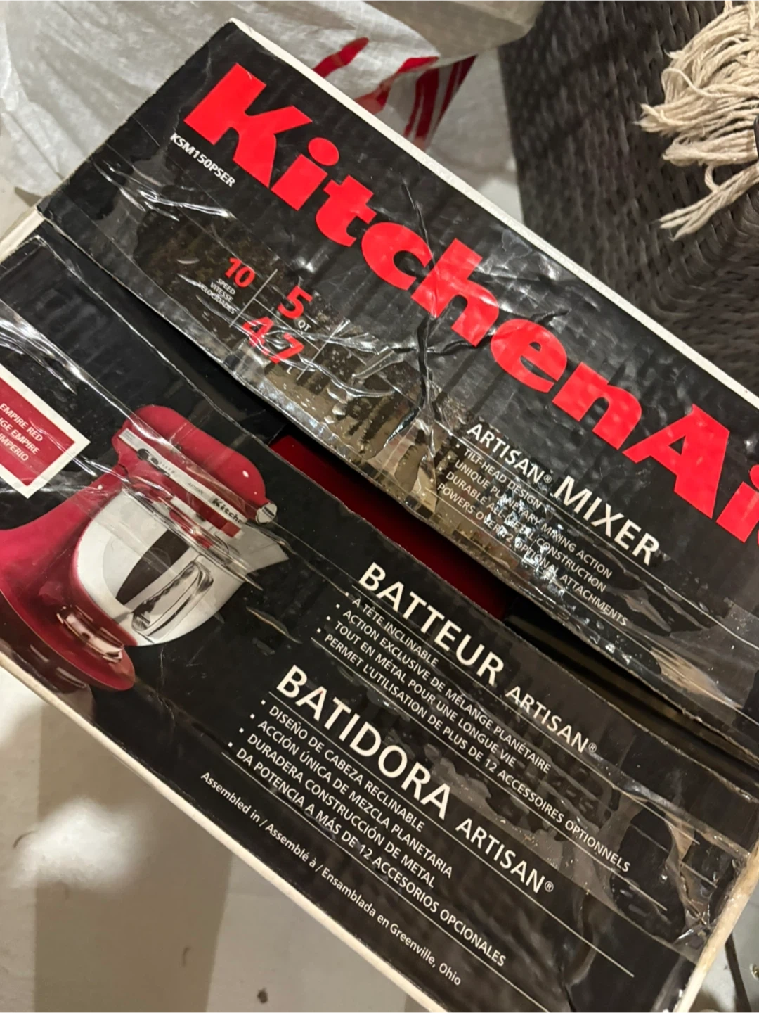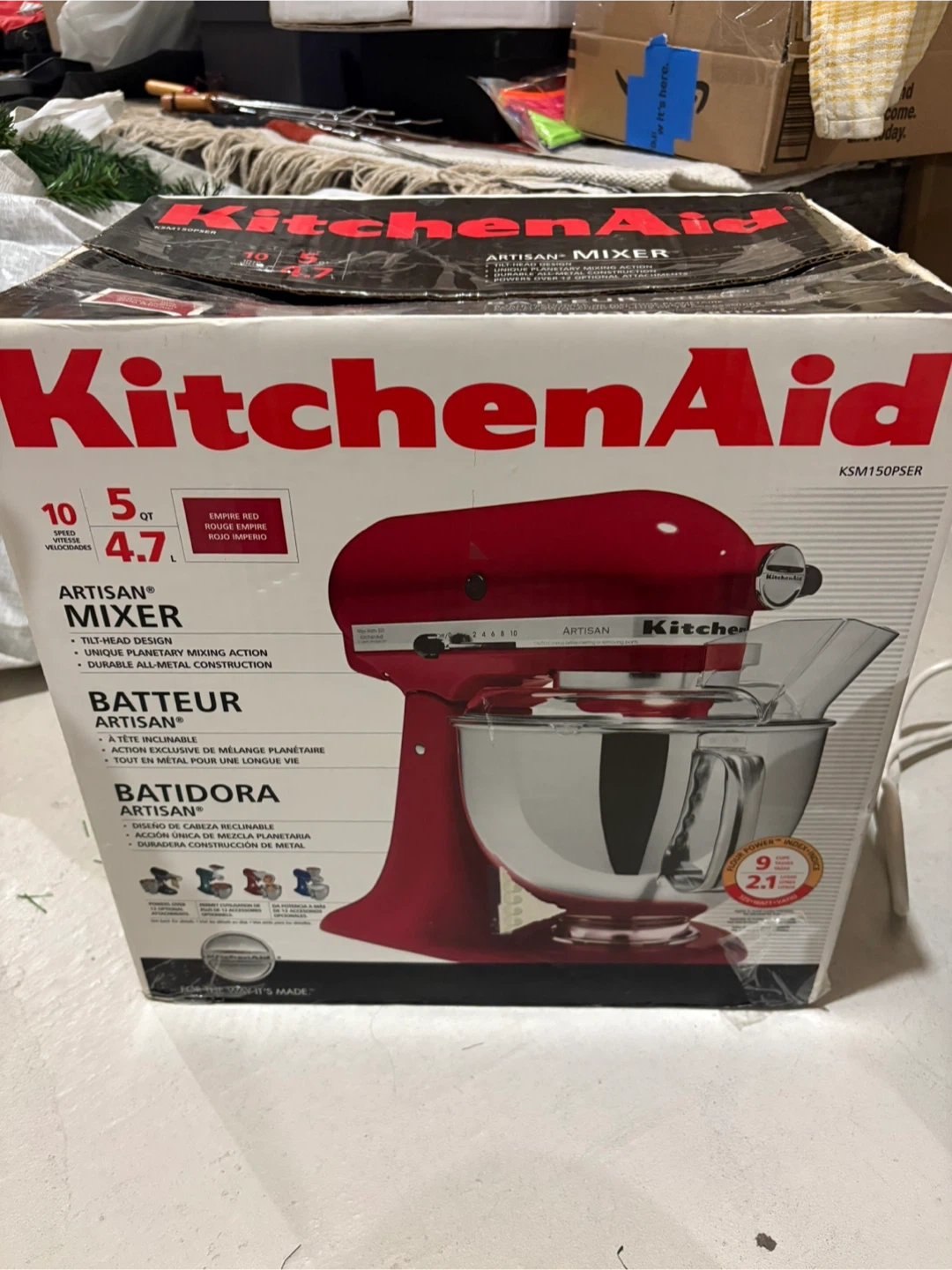 Selling a KitchenAid Artisan Mixer in Empire Red. This is a 5 Qt mixer with a tilt-head design and durable all-metal construction. It has a unique planetary mixing action and accepts various attachments. Perfect for all your baking needs! Comes in the original box - brand new!!
