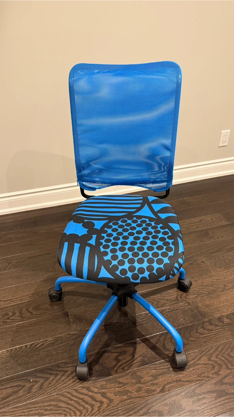 Selling a blue IKEA ALEFJÄLL swivel chair! It's in great condition and would be perfect for a home office or student. The seat has a fun blue and black pattern. It's a comfortable and stylish chair!