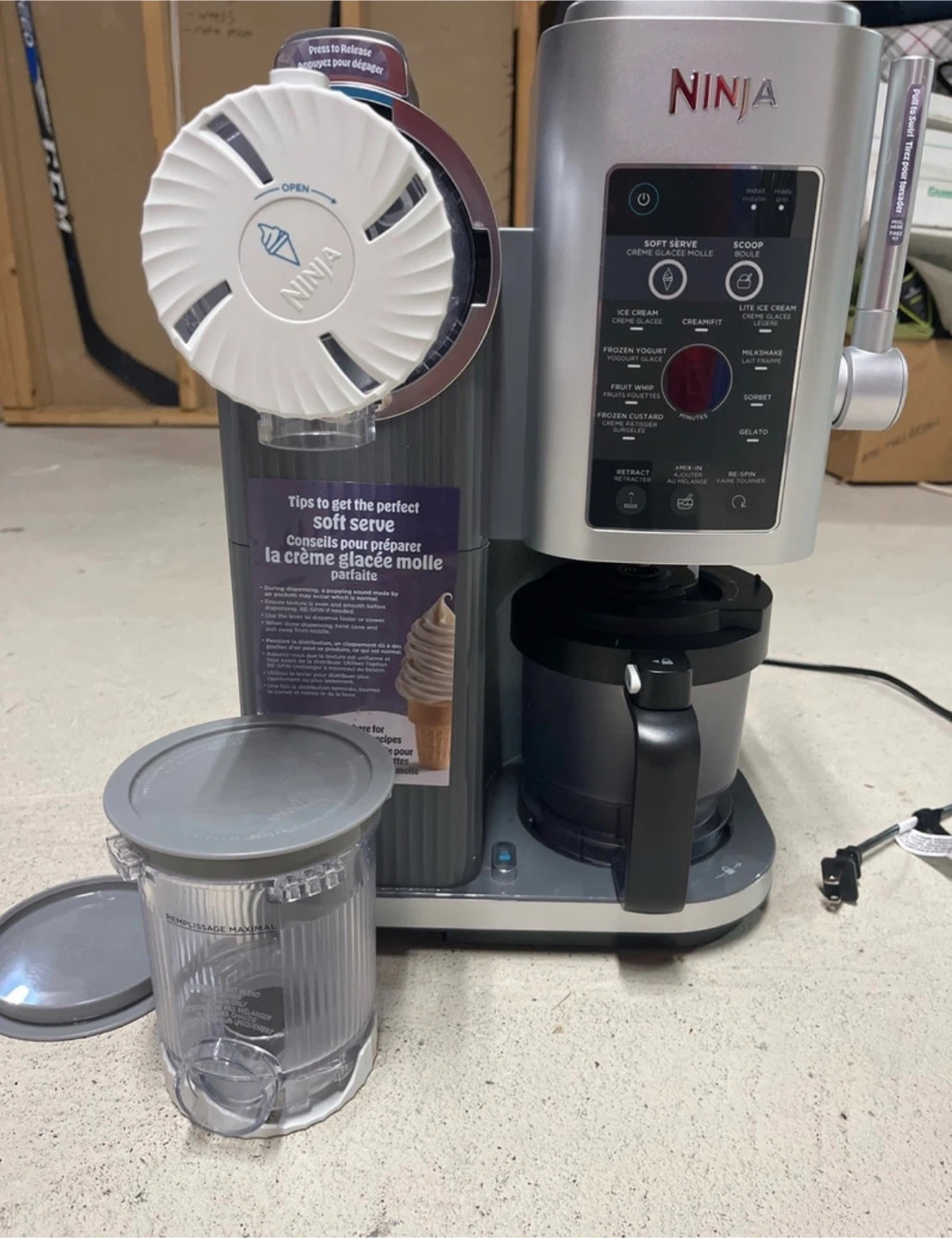 Get ready to whip up some delicious frozen treats with this Ninja CREAMi! It can make everything from ice cream and gelato to milkshakes and sorbet. It's in great condition and ready for a new home. It includes a container for recipes