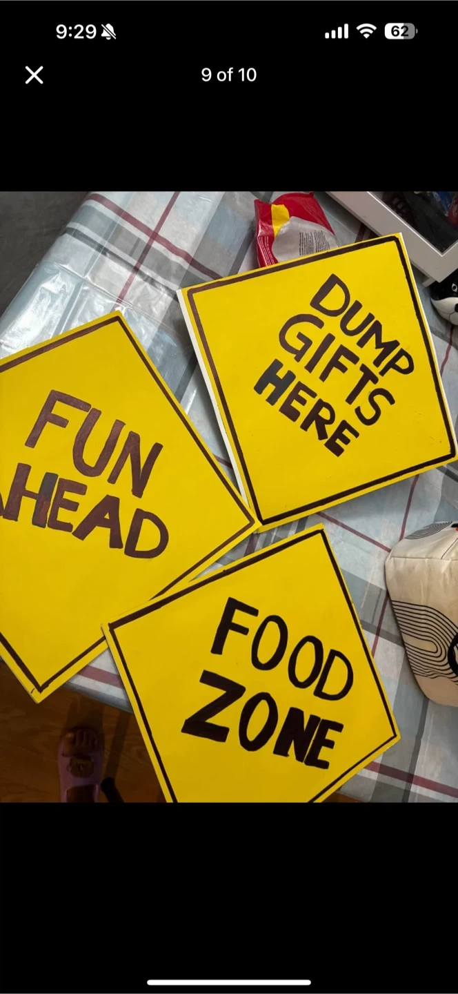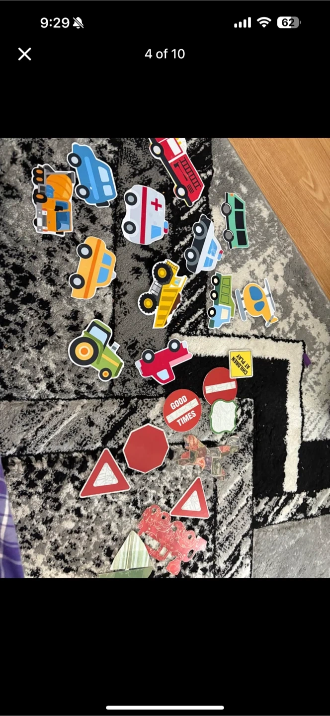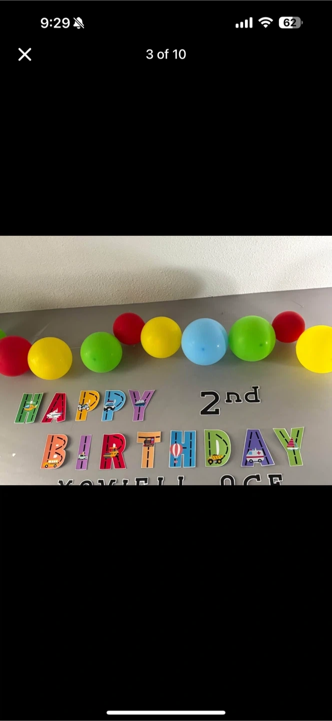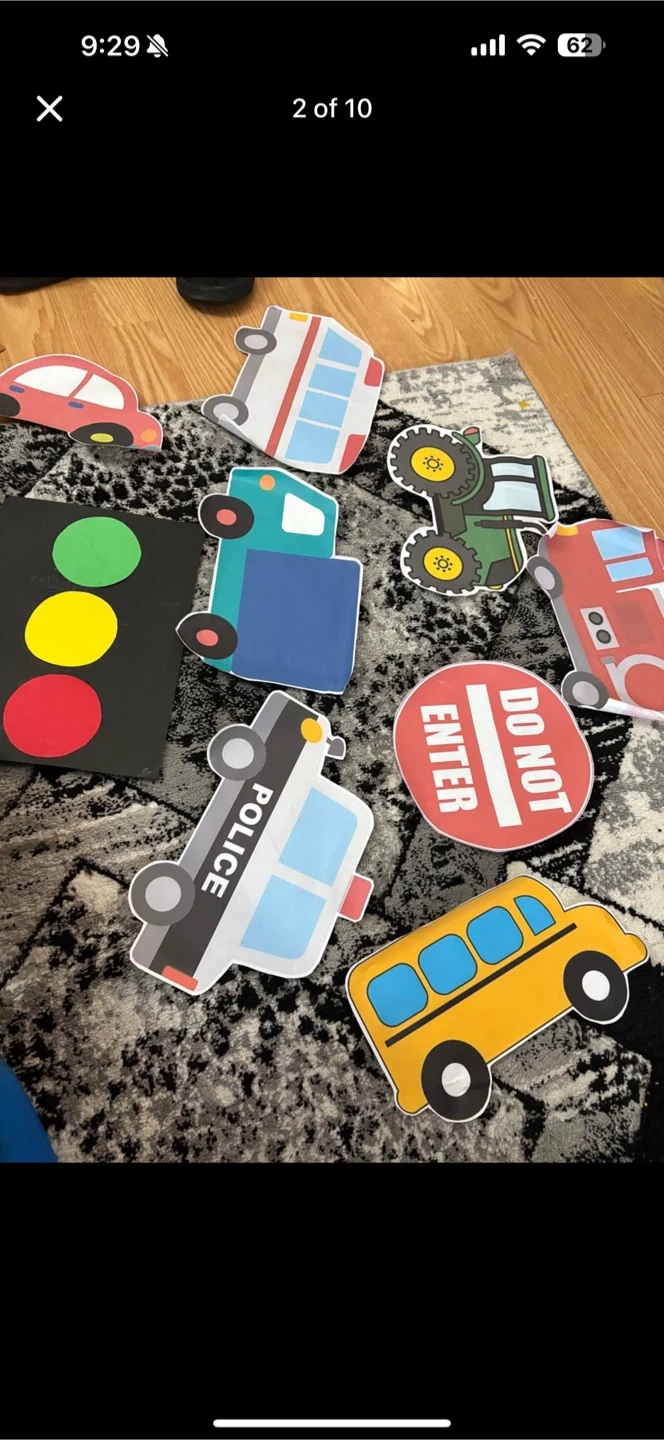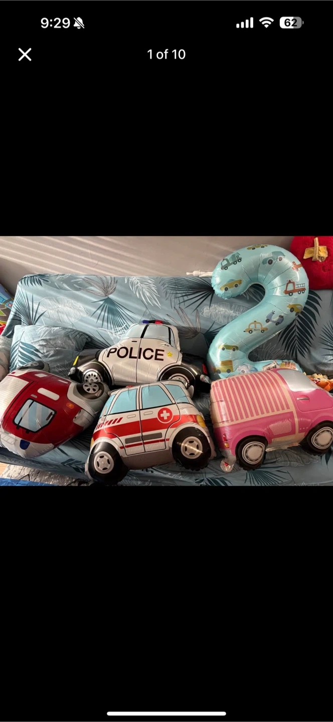 Selling birthday party decorations, all with a fun cars theme! Includes balloons shaped like different vehicles and number 2, plus lots of cutouts of cars, trucks, and traffic signs. Perfect for a second birthday party!