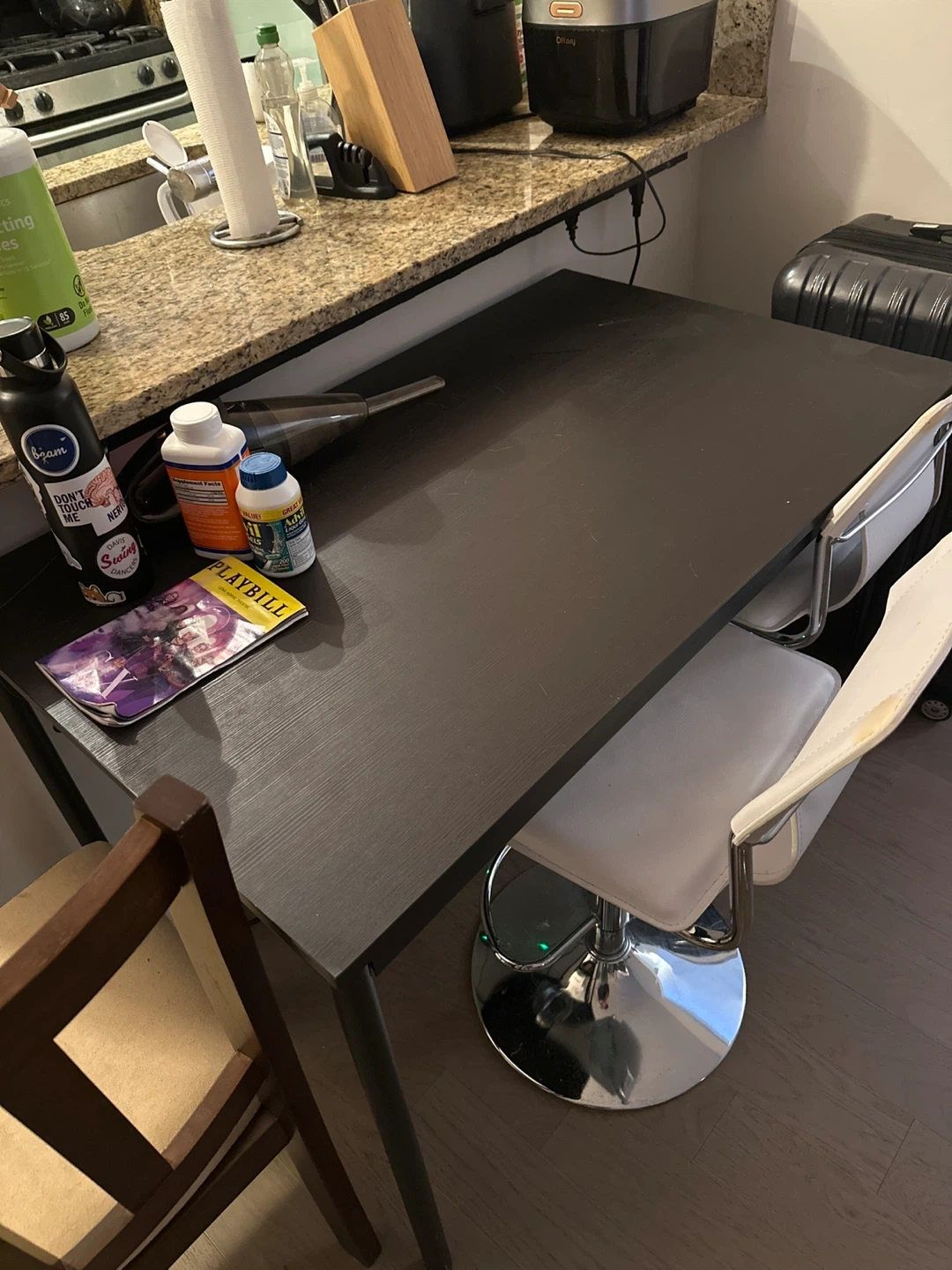 Selling a used black table with a couple of chairs. It's perfect for a small dining area or workspace. The table is sturdy and the chairs are comfortable. Great for a student or small family!