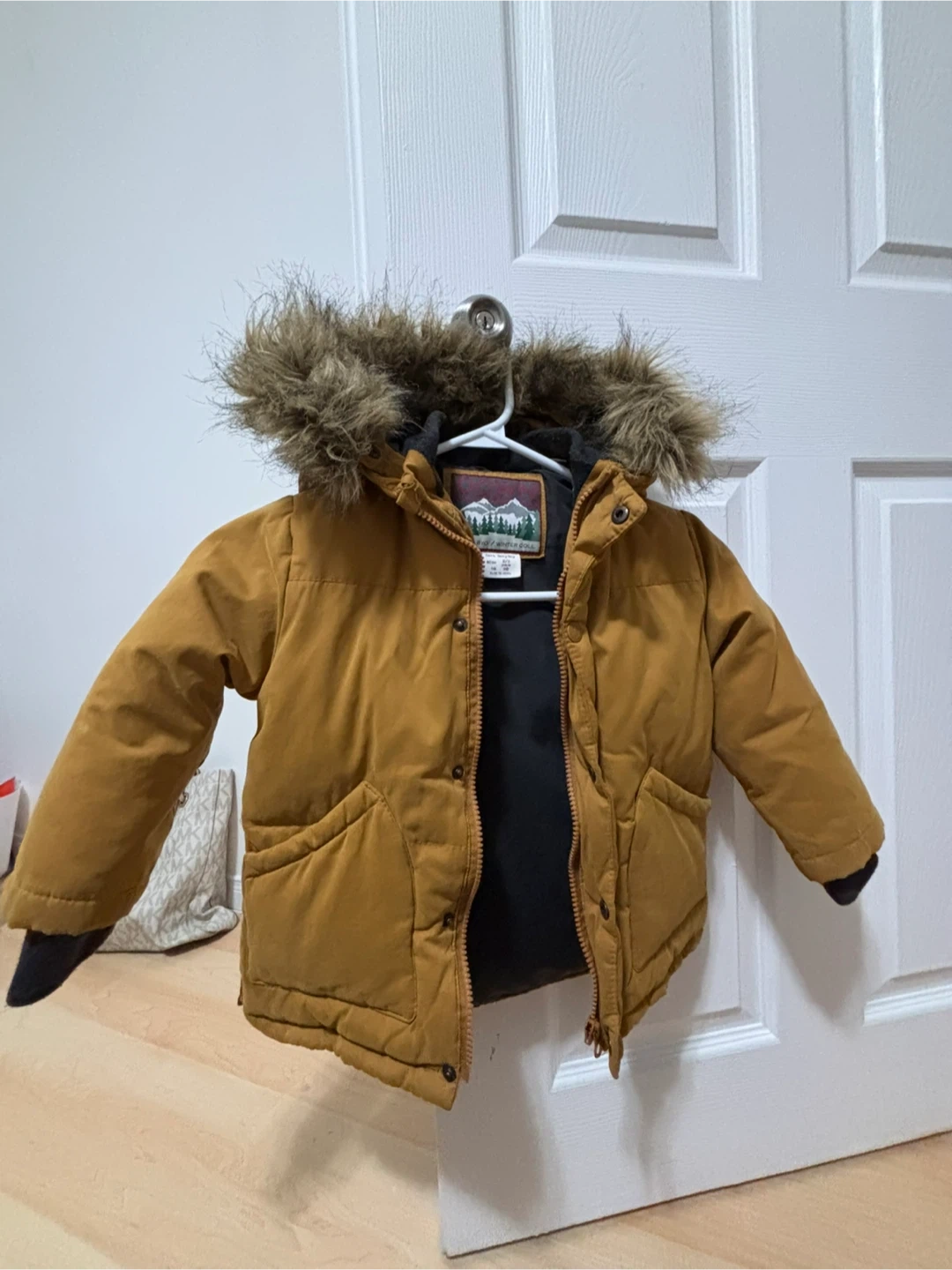 A cozy puffer jacket for kids! It's a size 4 and features a furry hood to keep your little one warm during the colder months. Perfect for outdoor adventures or just everyday wear!