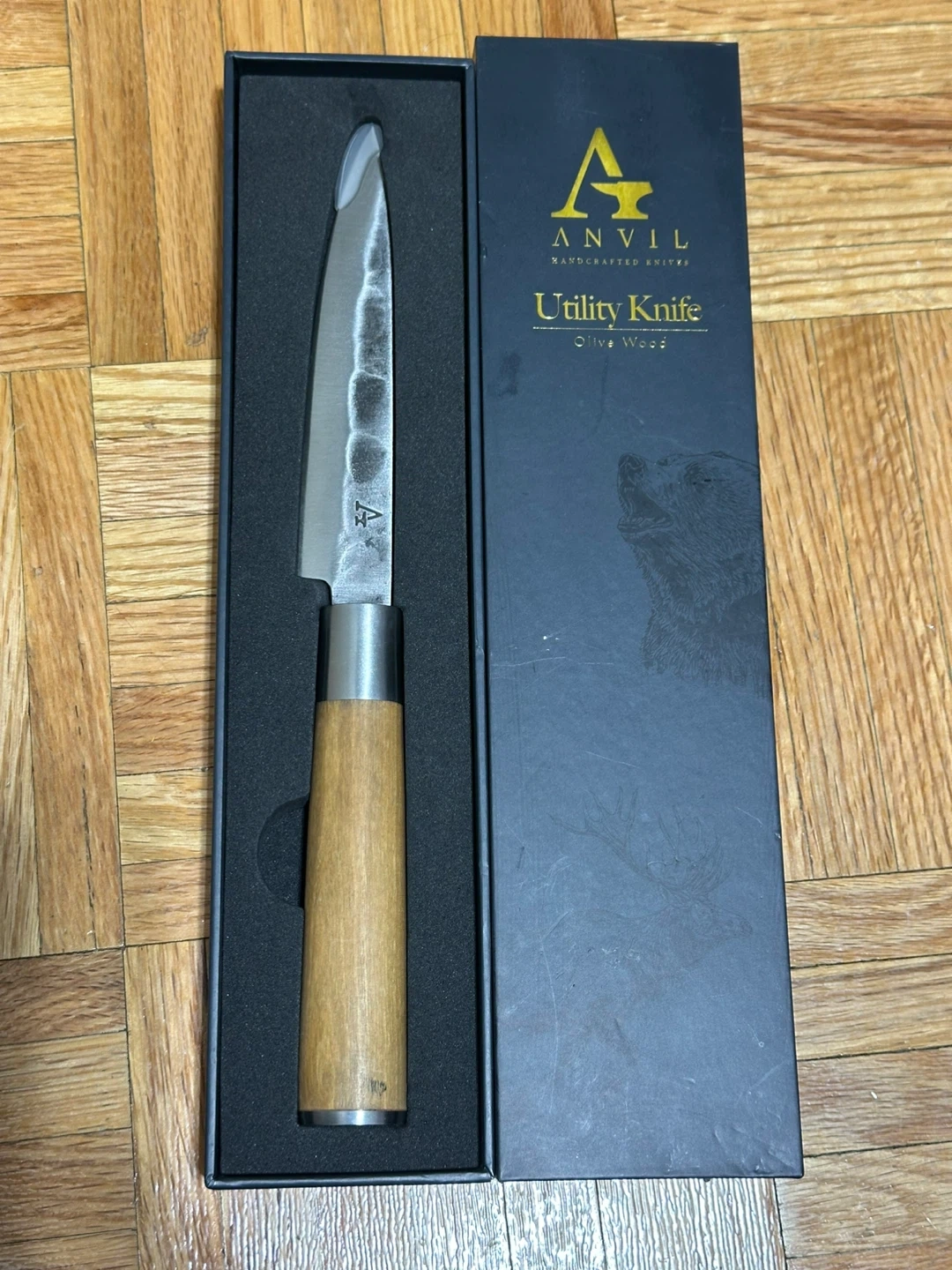 Selling an Anvil handcrafted utility knife with an olive wood handle. It comes in its original box. This knife is perfect for various kitchen tasks and would make a great addition to any cooking enthusiast's collection