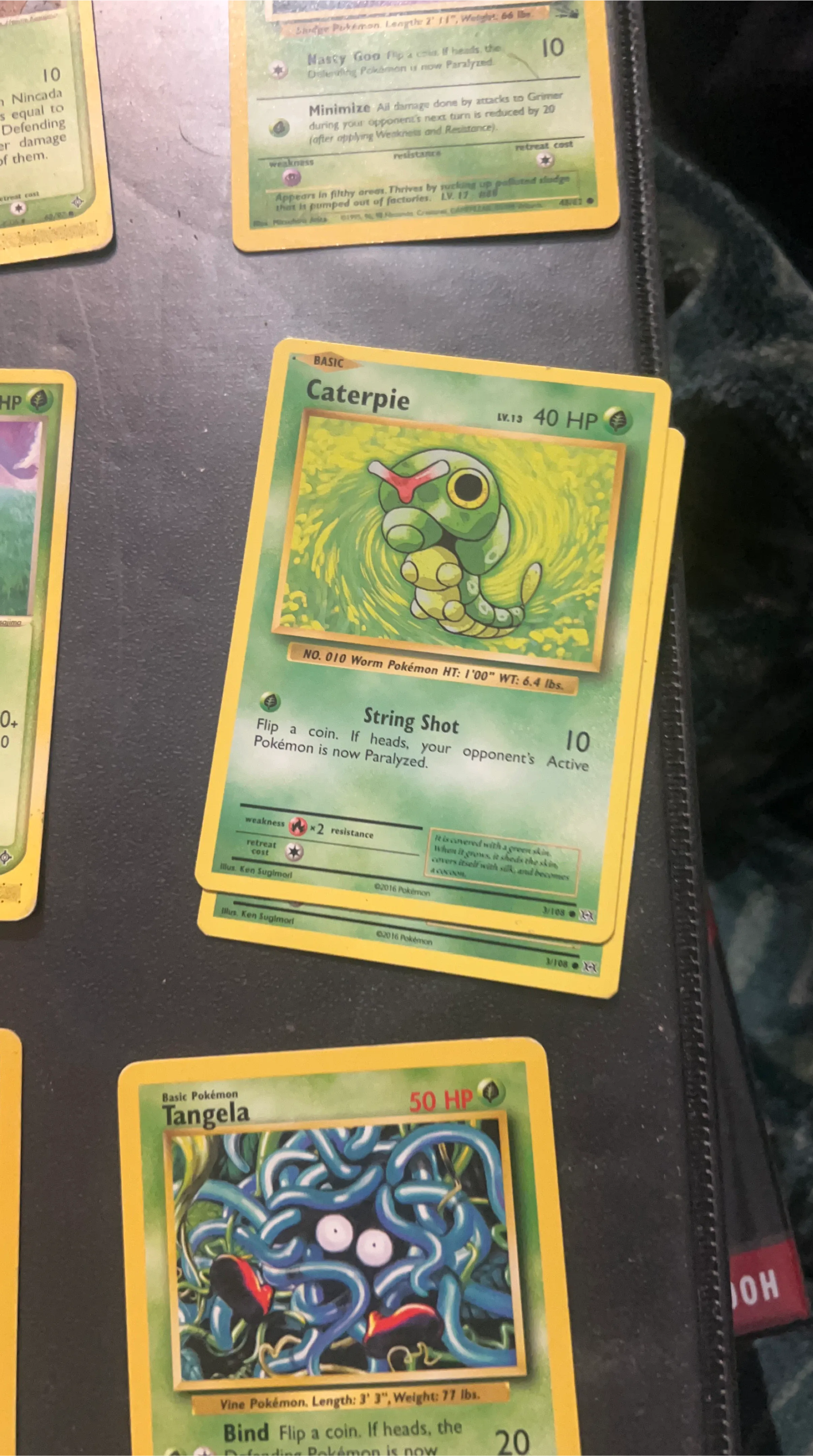 Selling a basic Caterpie Pokemon card. It's got a green skin and is a worm Pokemon. It's LV.13 and has 40 HP. String Shot does 10 damage.