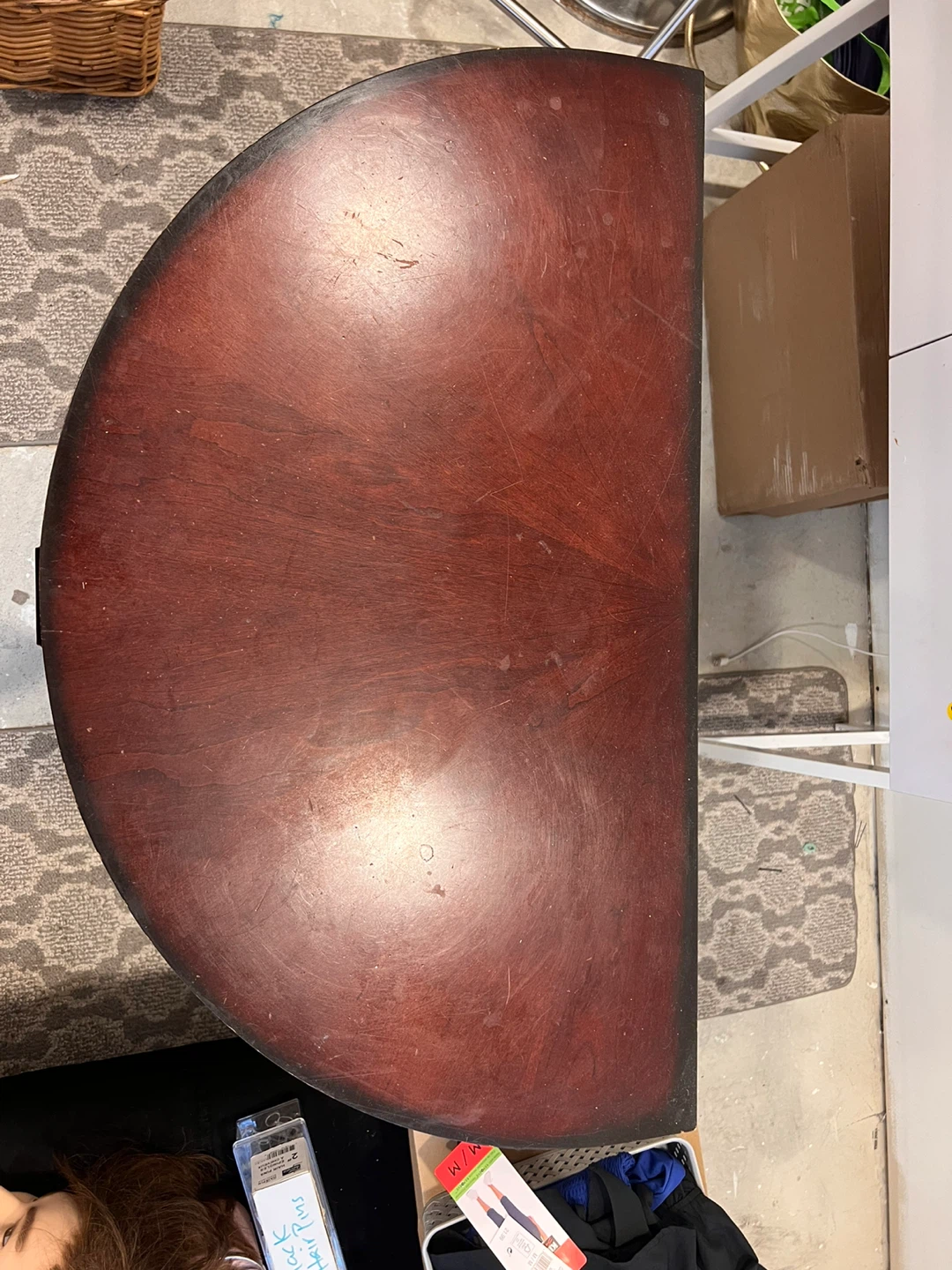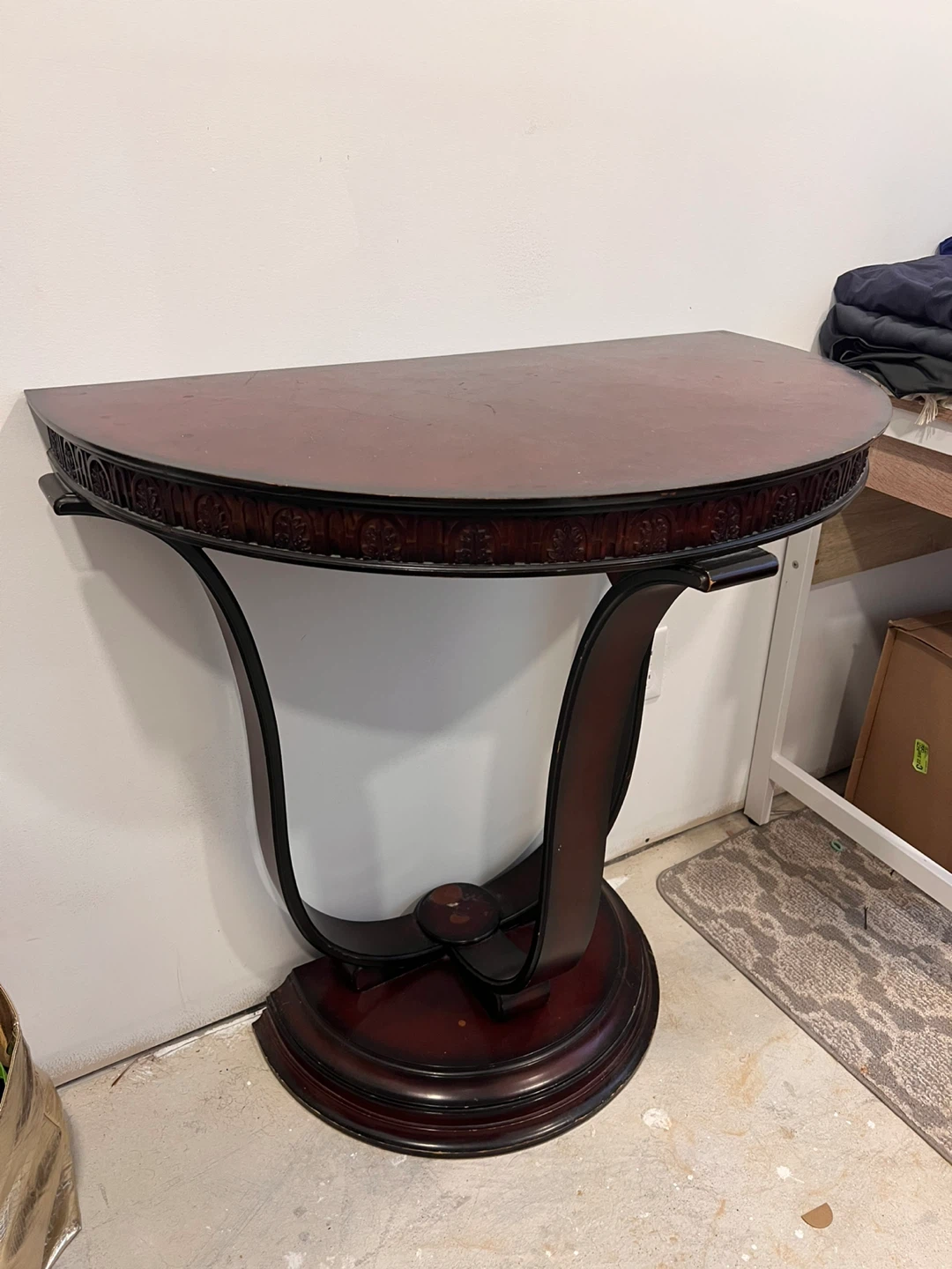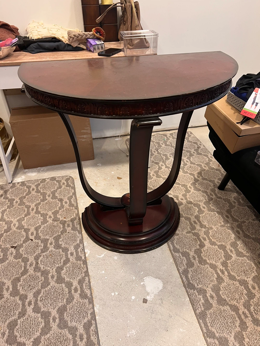 Selling a lovely half-round entryway table. It features a dark wood finish and a unique, curved design. Perfect for adding a touch of elegance to your hallway or living room! There are some signs of use.