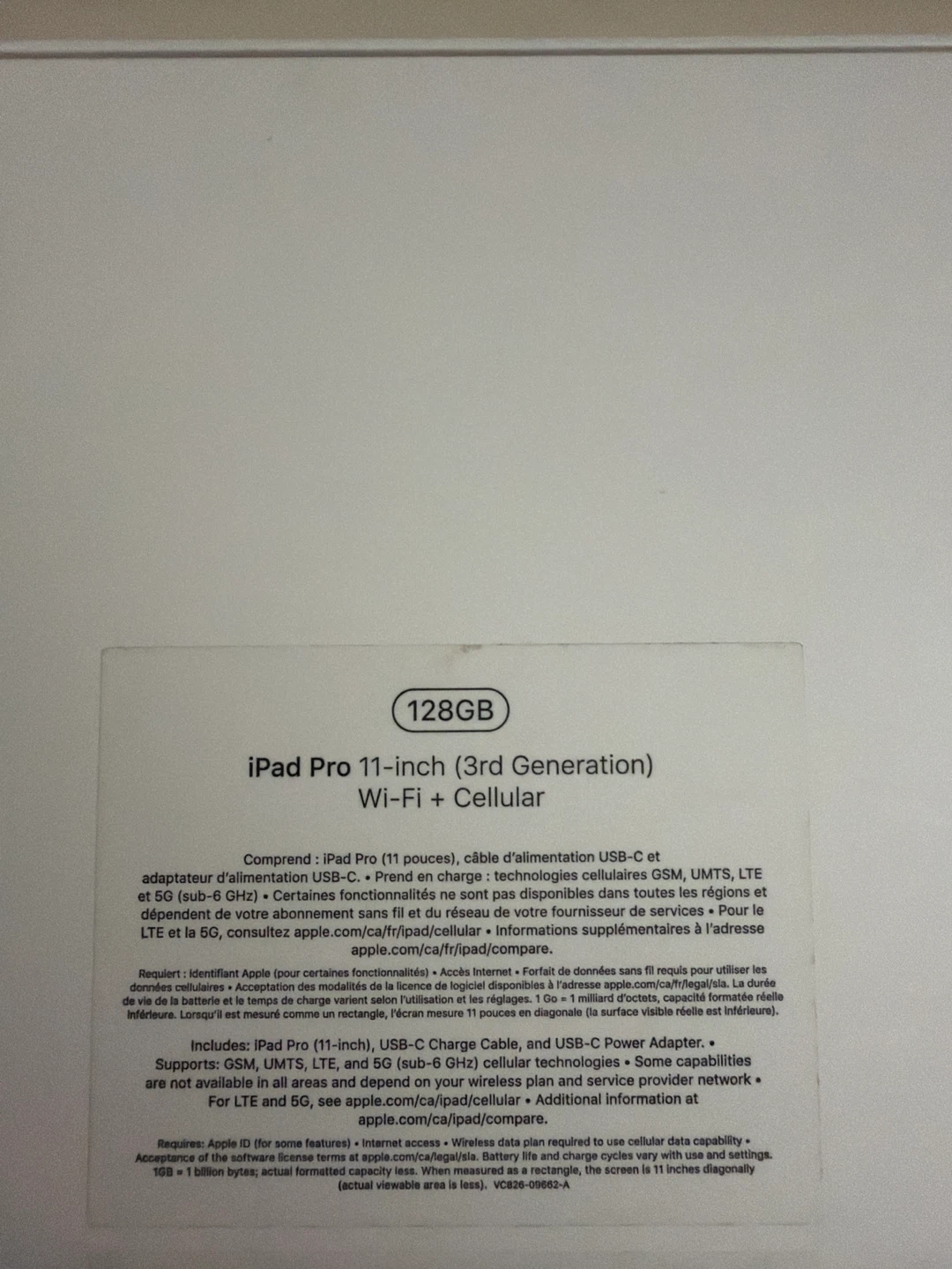 iPad Pro 11-inch (3rd Generation) with M1 chips, 128GB, Wi-Fi and Cellular connectivity. No scratches at all even the display. All is just like really new