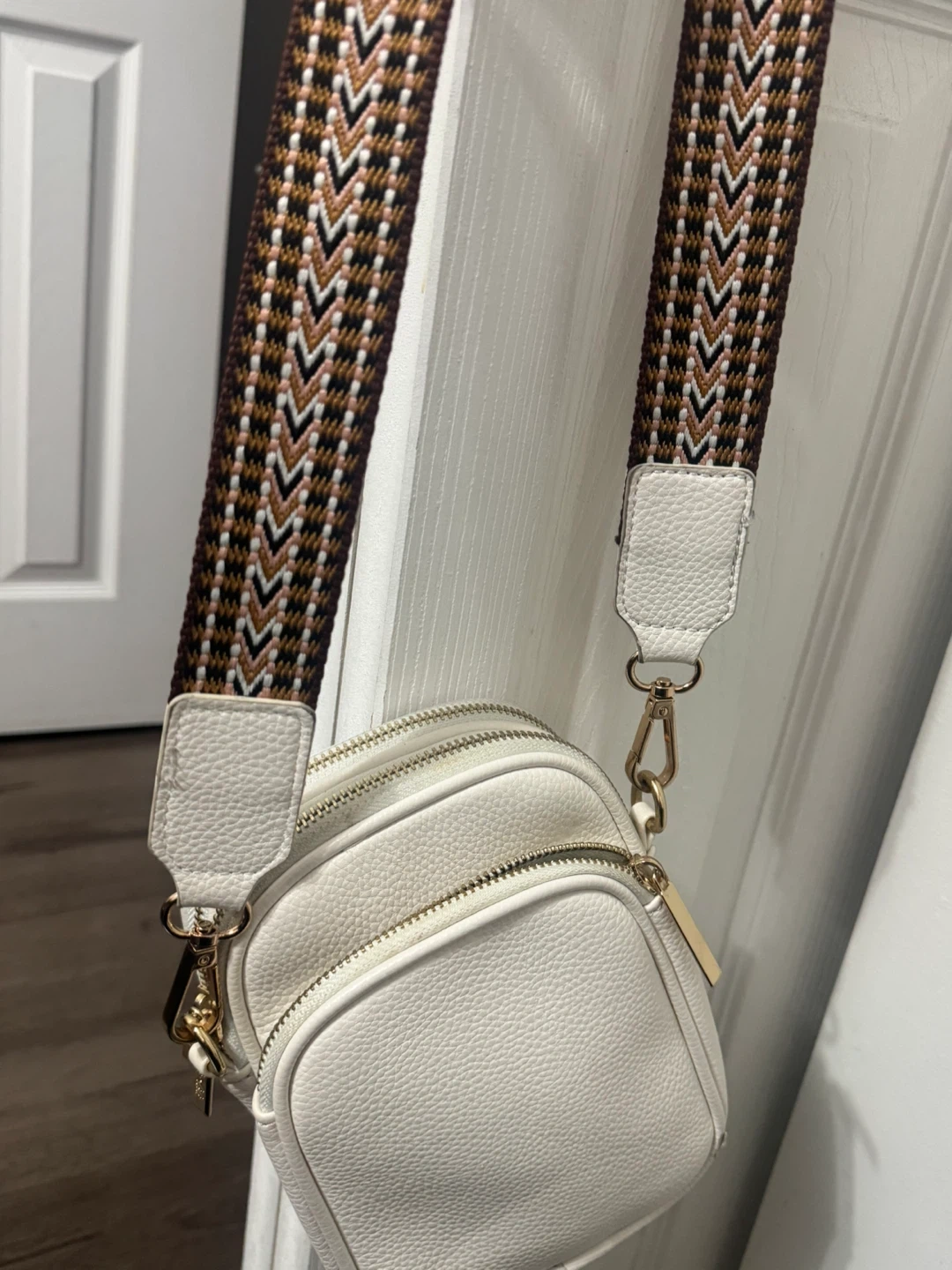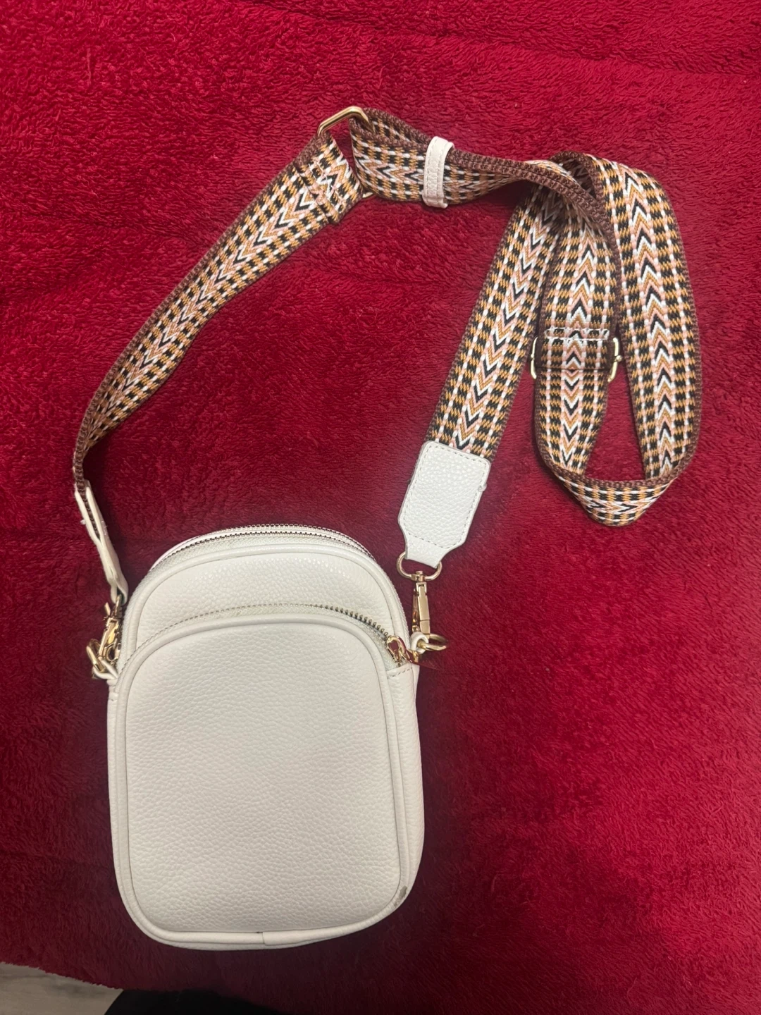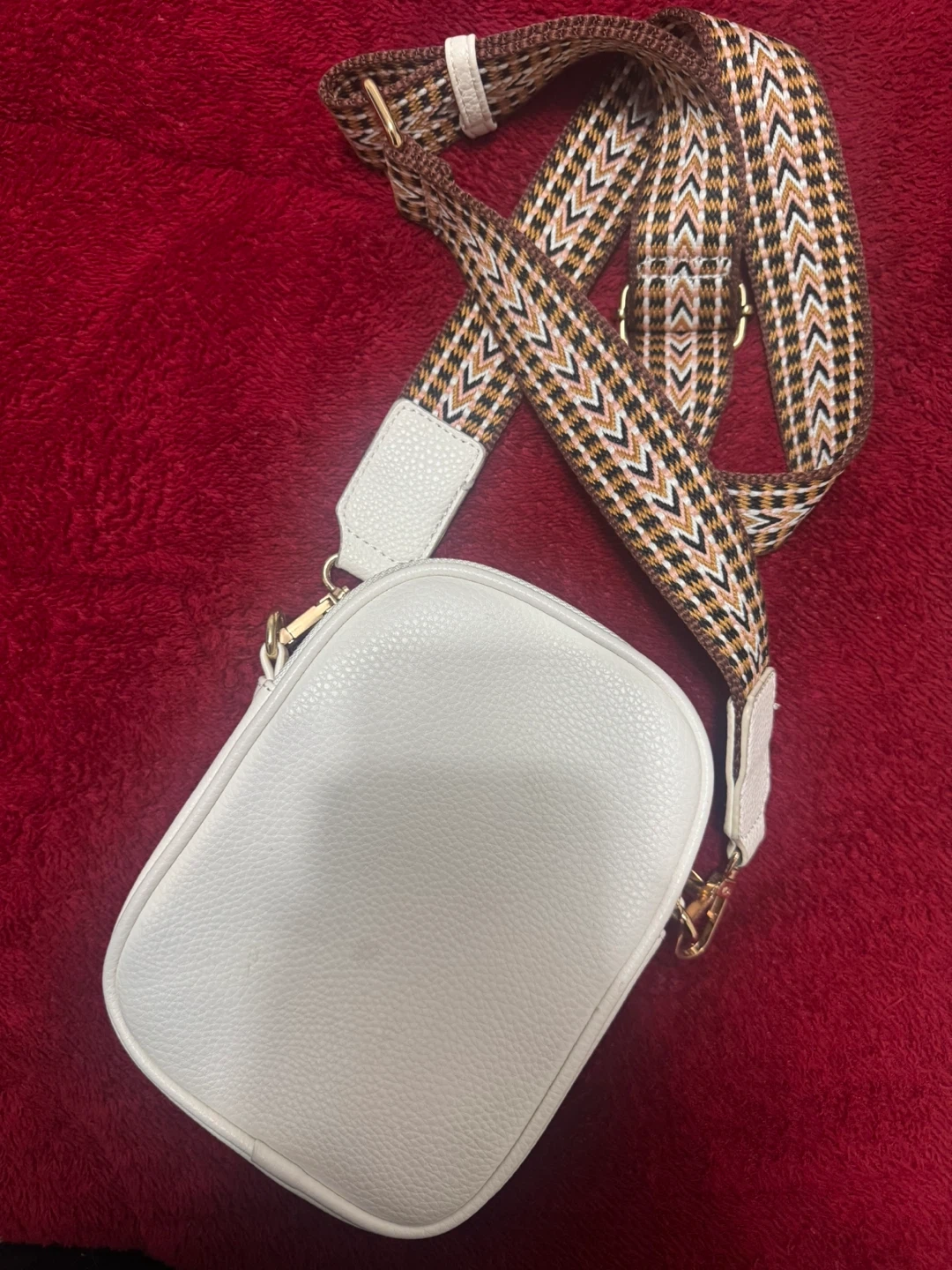 Selling a cute white crossbody bag. It features a patterned strap in brown, white, and black tones. It's perfect for carrying your essentials while adding a stylish touch to your outfit!