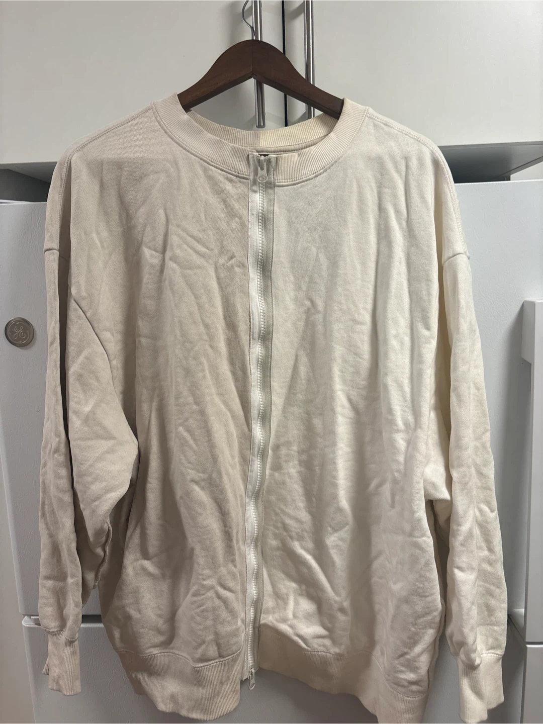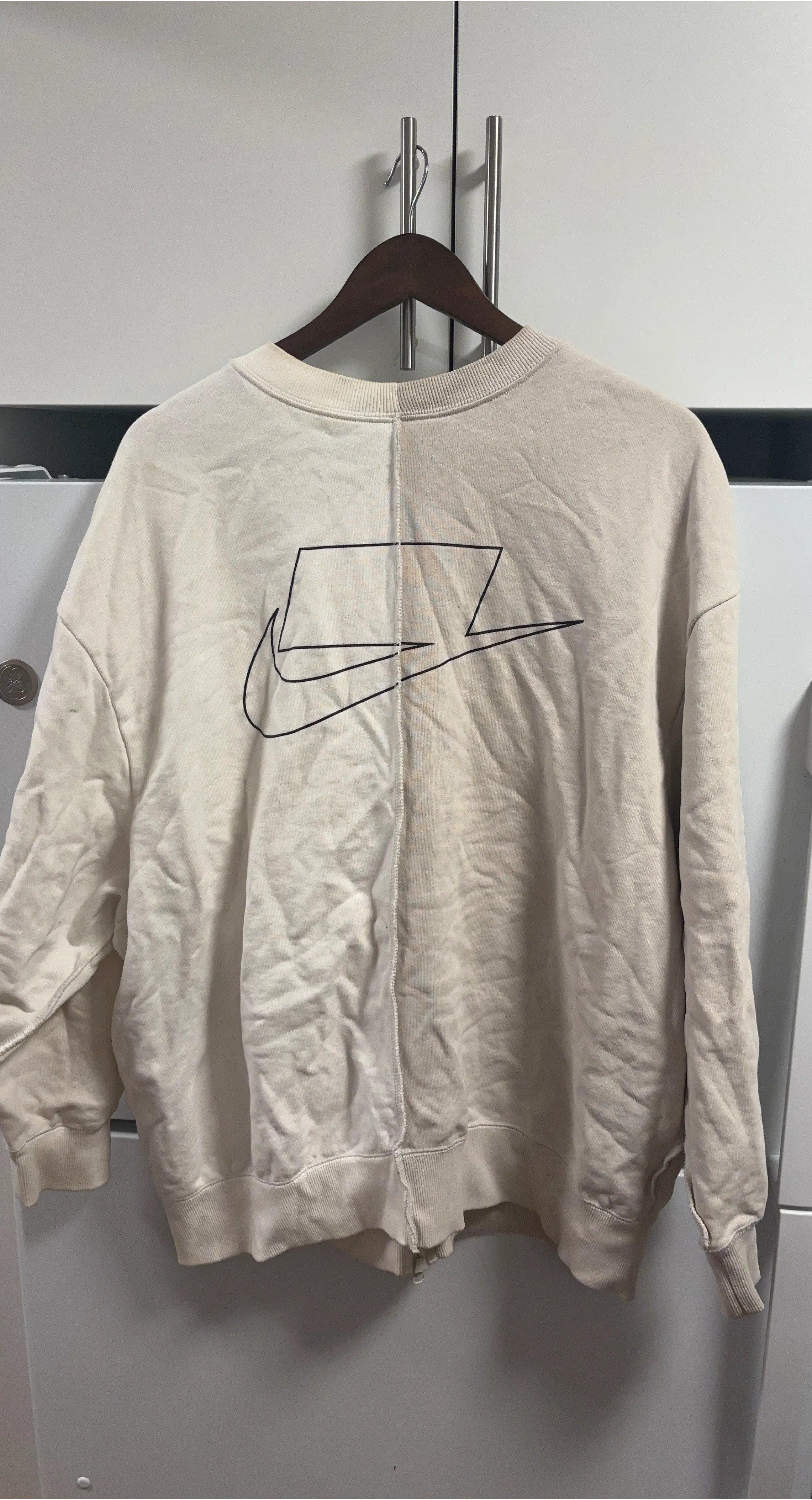 Selling a cream-colored Nike sweatshirt. It has a unique design with a zipper down the front and a large logo on the back. It's in great condition and ready for a new owner!