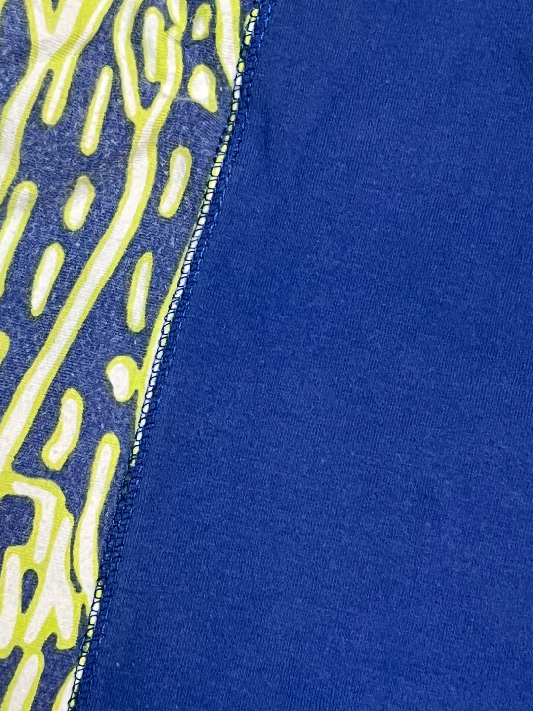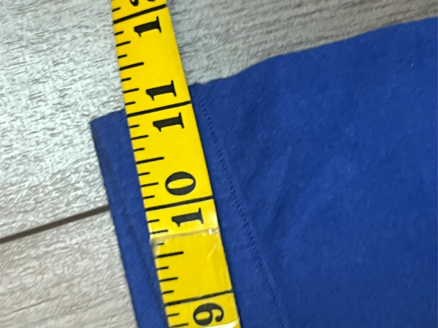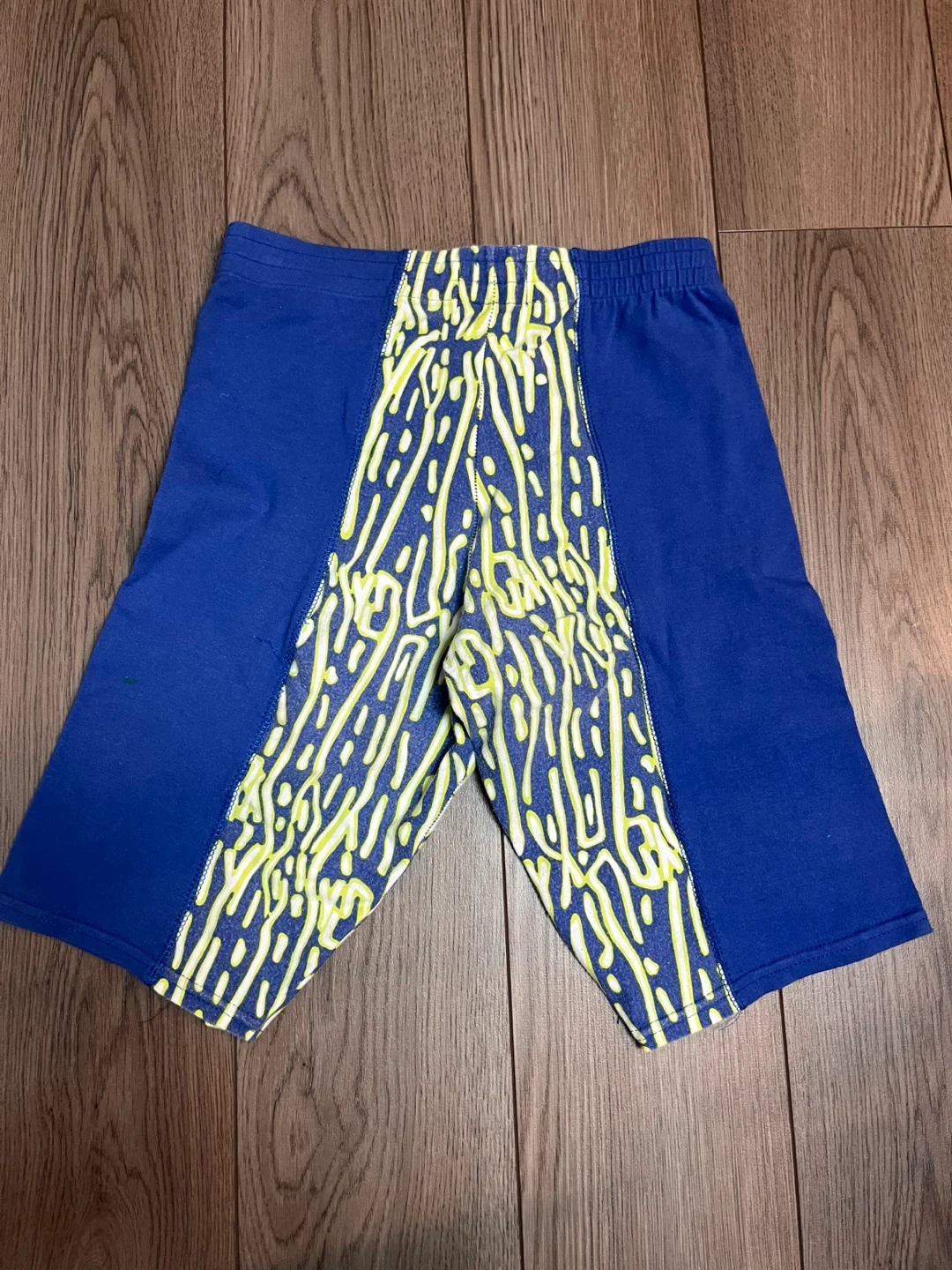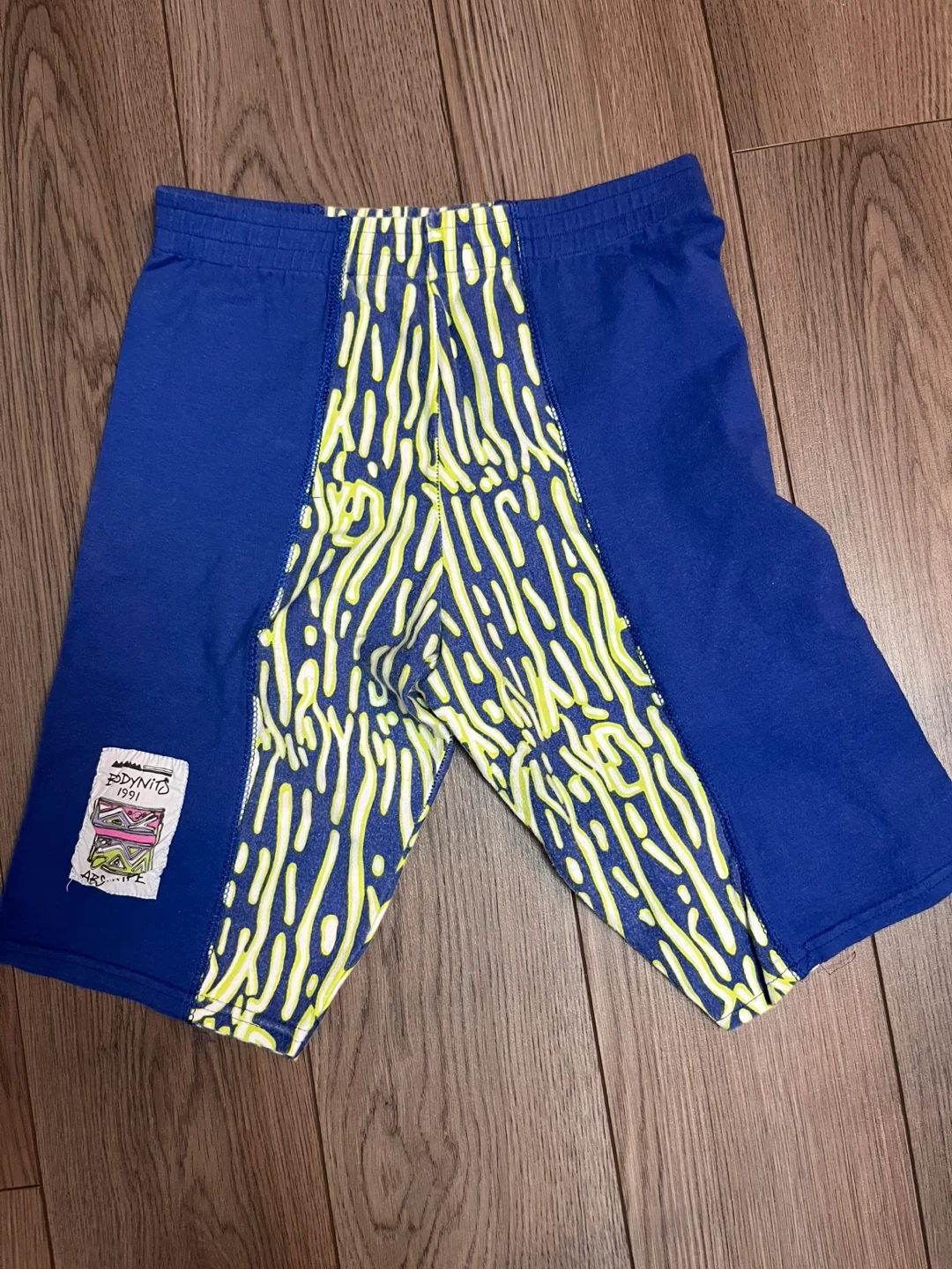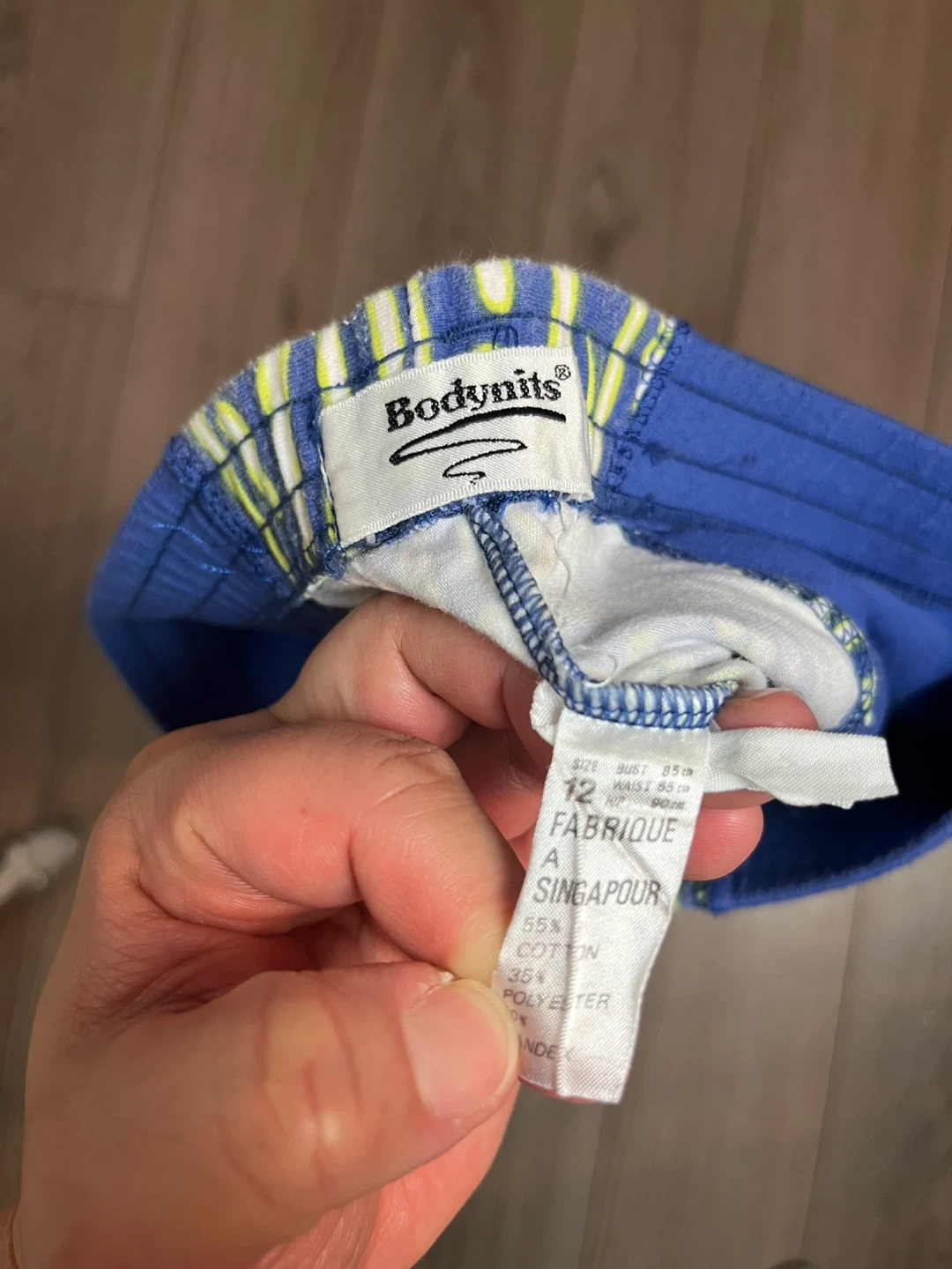 Vintage Bodyknits shorts in size 12! They're blue with a unique pattern on the front. The material is 55% cotton and 35% polyester, making them comfy and durable.