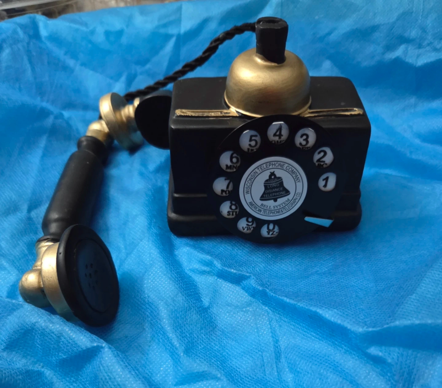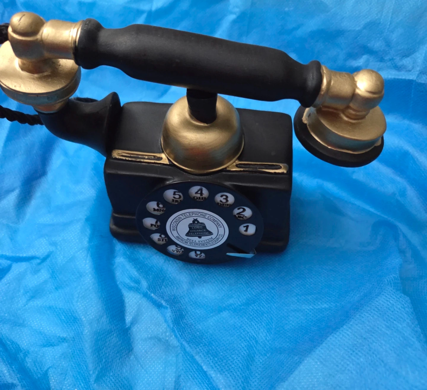 Selling a vintage-style replica telephone from the Wisconsin Telephone Company. It's a charming decorative piece with a classic rotary dial design and black and gold accents. A great addition to any vintage collection or as a unique home decor item.