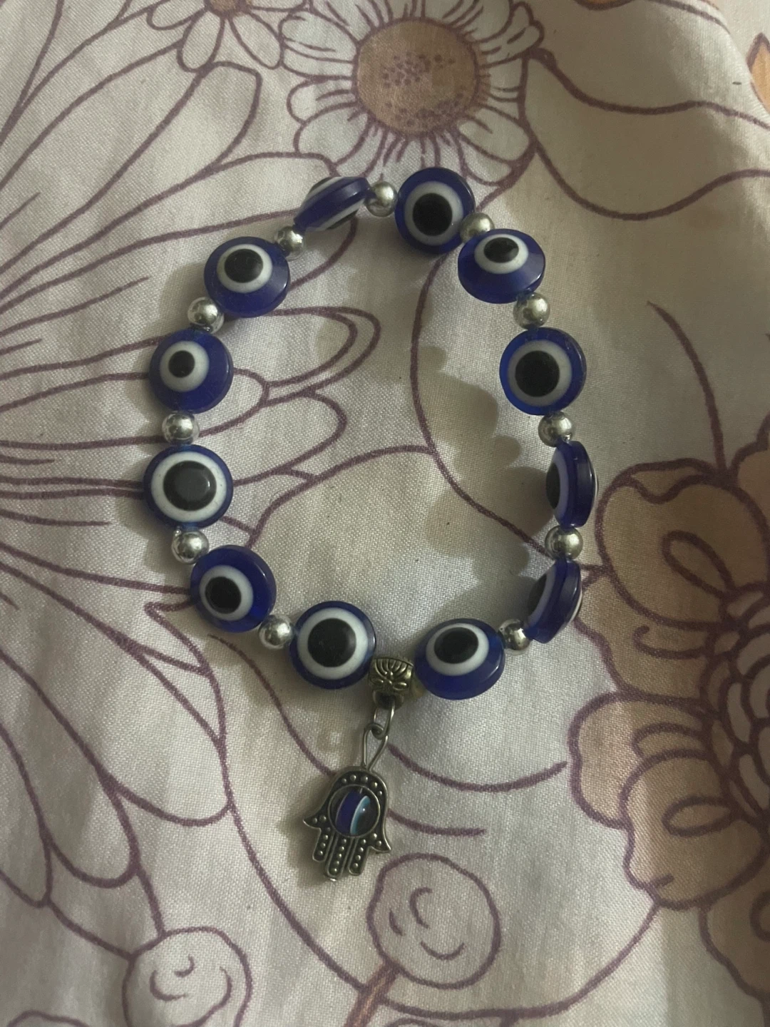 This is a cute blue evil eye bracelet with a Hamsa hand charm. It's in great condition and ready to wear!