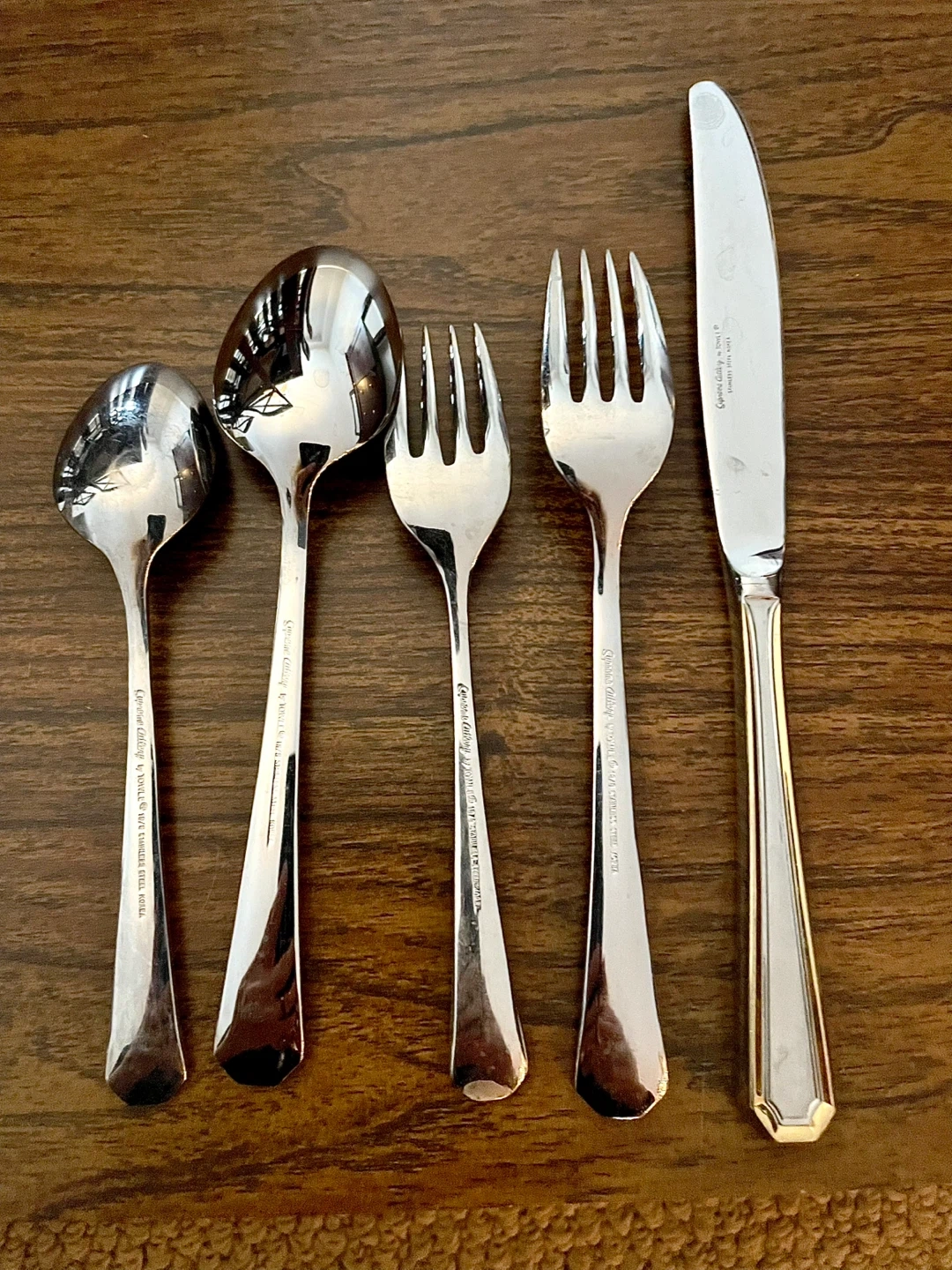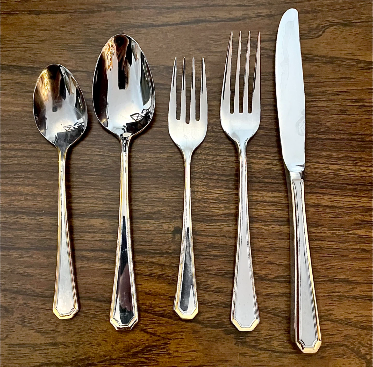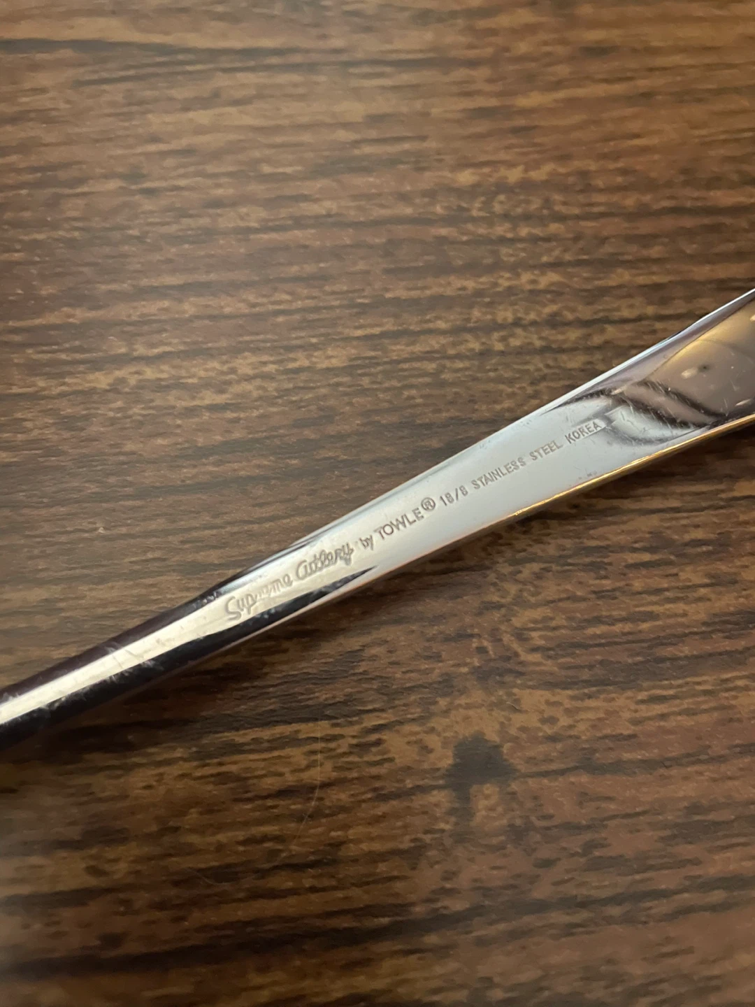 Selling a Towle Supreme Cutlery flatware set. It's made of 18/8 stainless steel with gold trim and comes in a wooden cutlery box. Great for adding a touch of elegance to your dining experience.