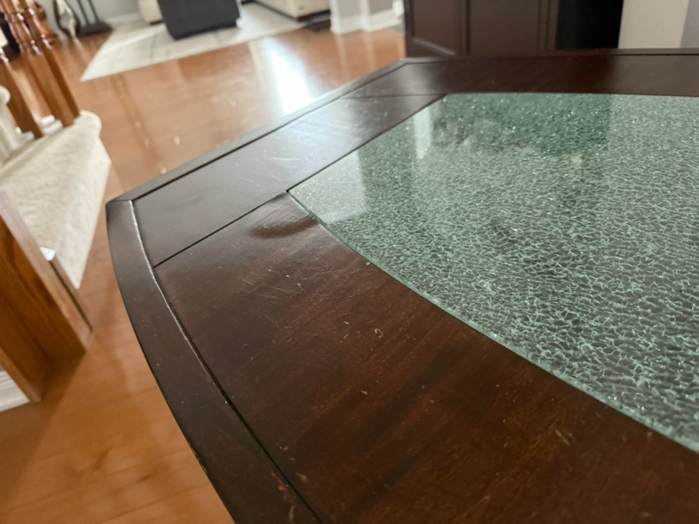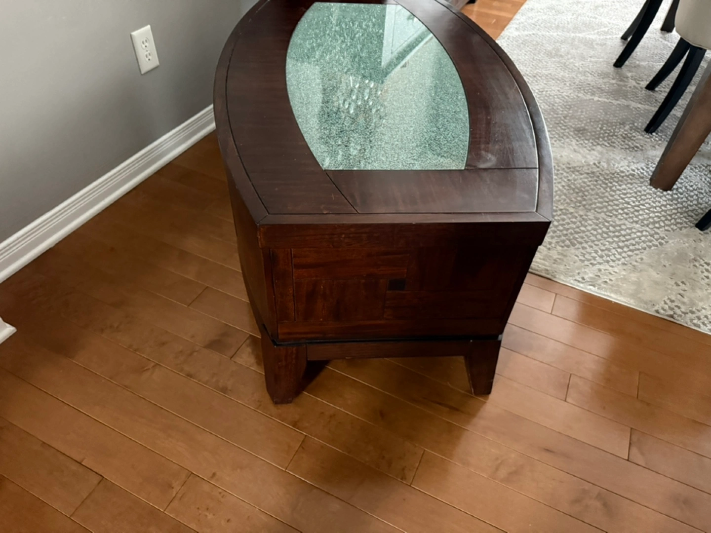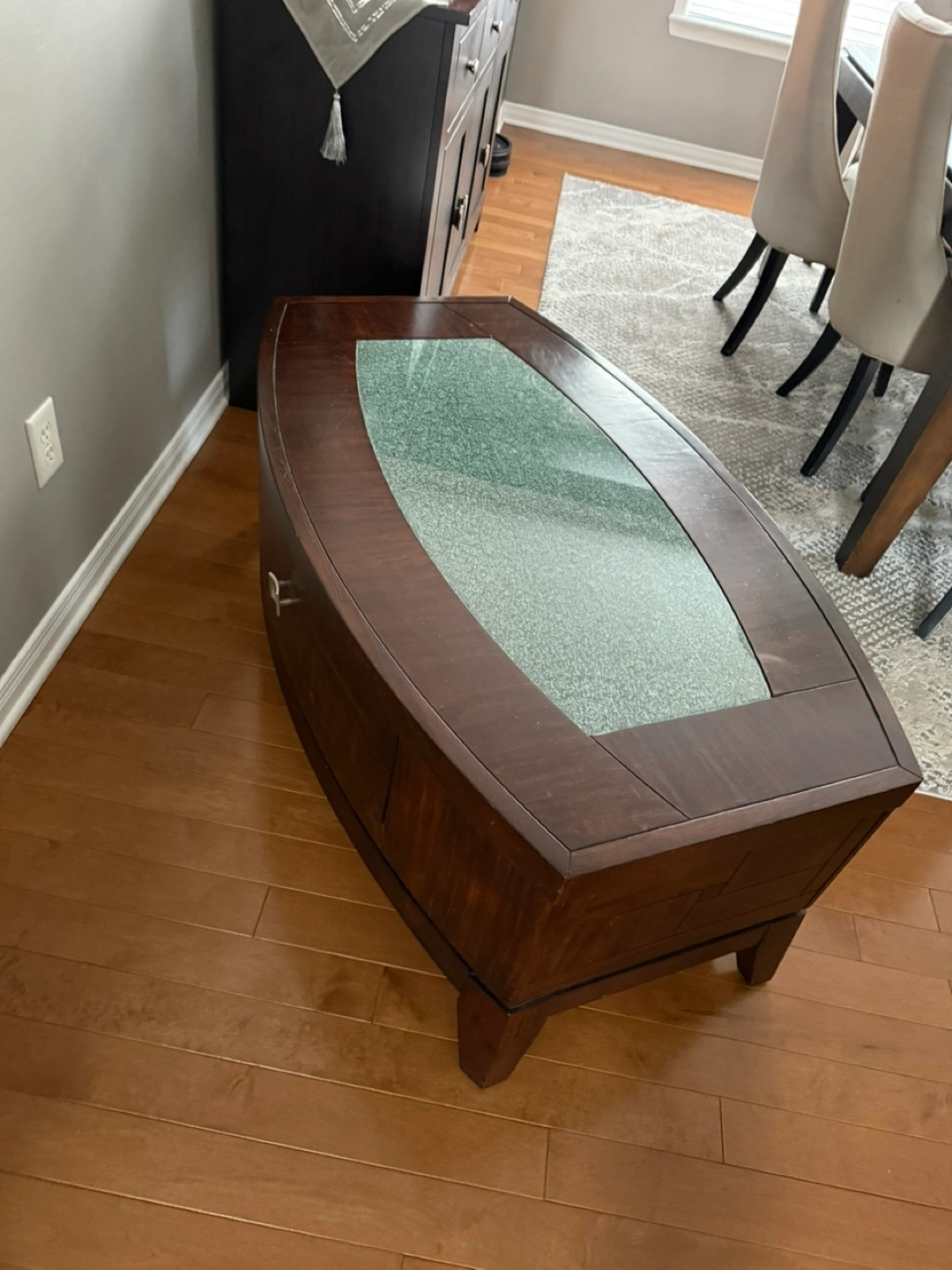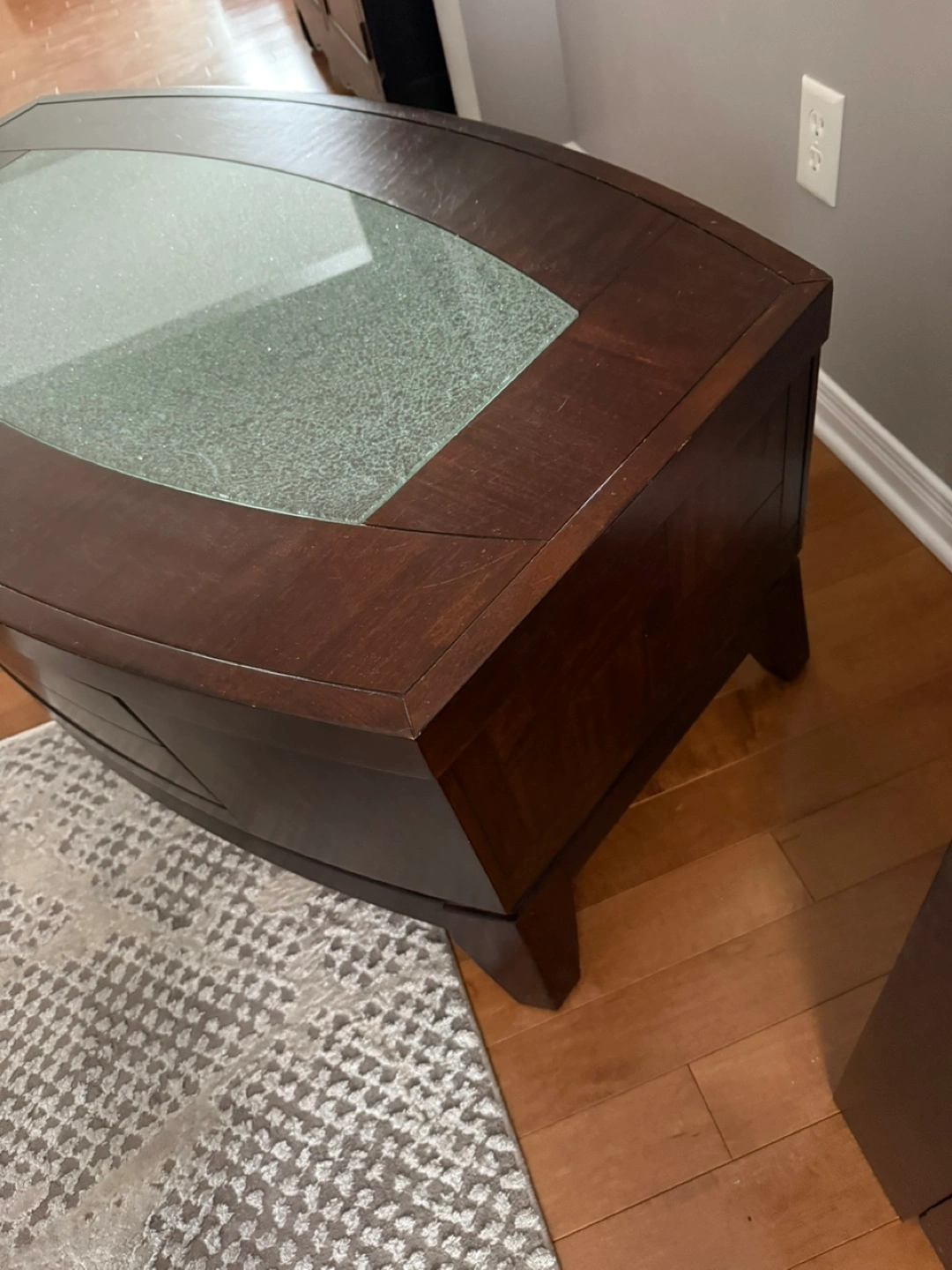 Selling a coffee table with a unique glass top. It has a dark wood finish and a curved design. The glass top has a textured appearance, adding a touch of elegance to any living room. There is some wear on the table and a small patch of swelling on the wood from water damage. Swelling shown in pics.