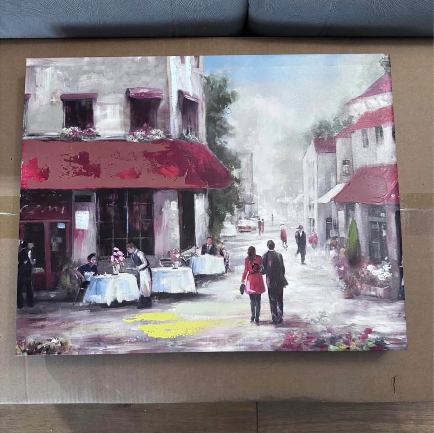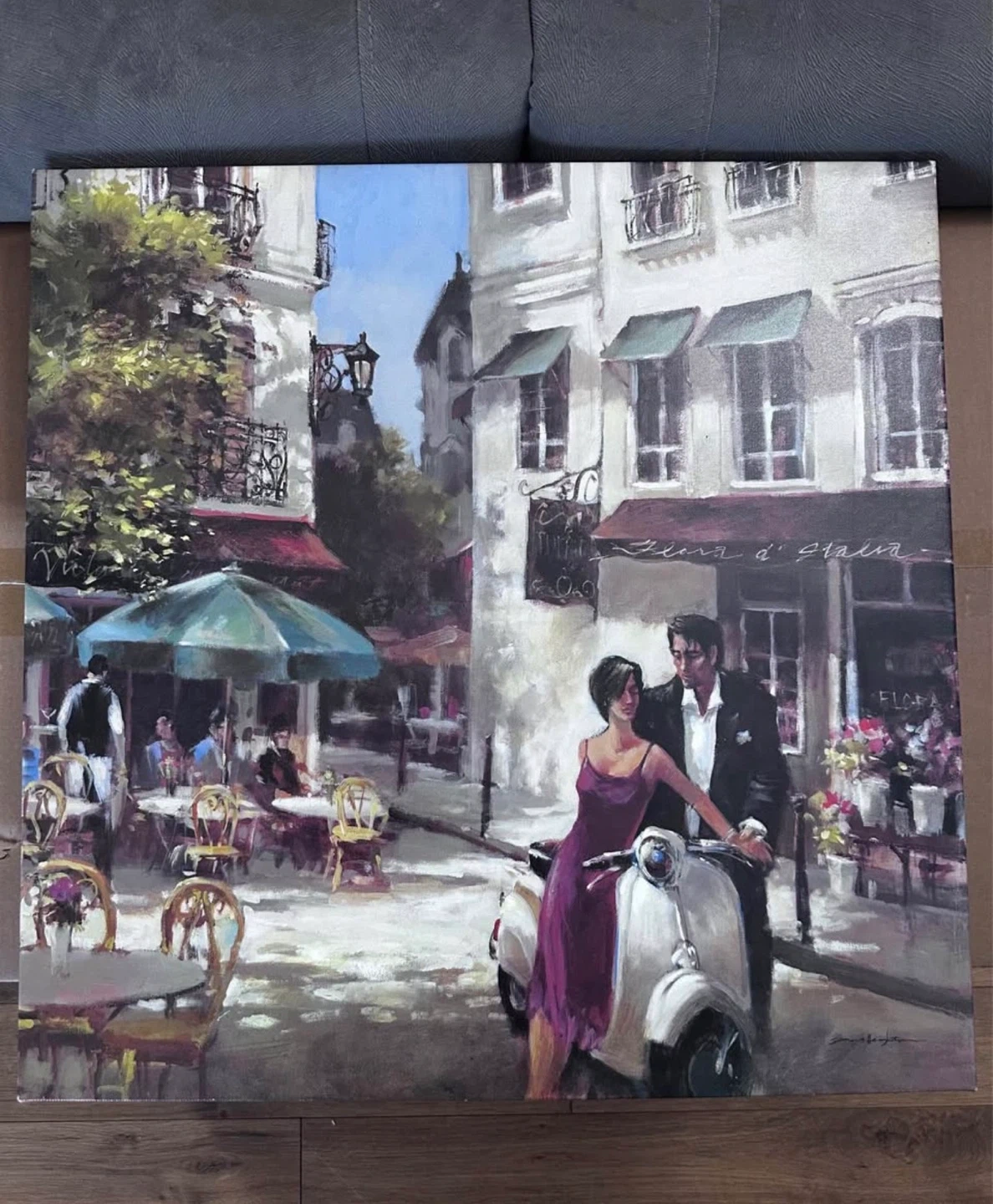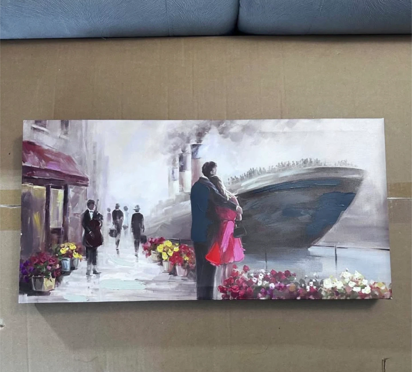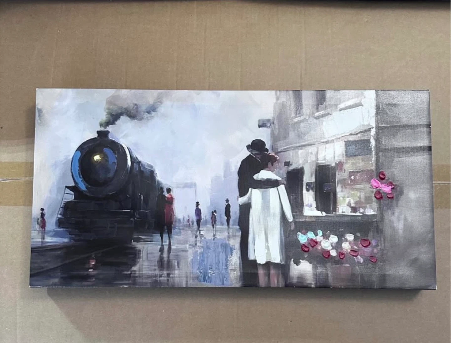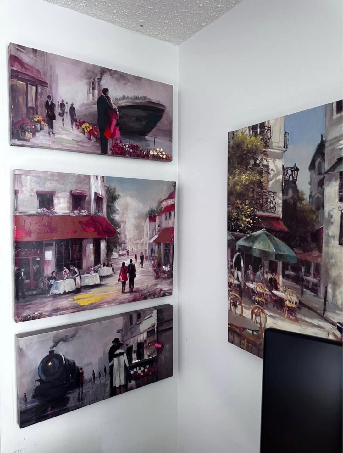 These four canvas prints depict romantic European street scenes. They feature couples embracing, a vintage scooter, and a steam train. The art style is painterly, with a focus on atmosphere.