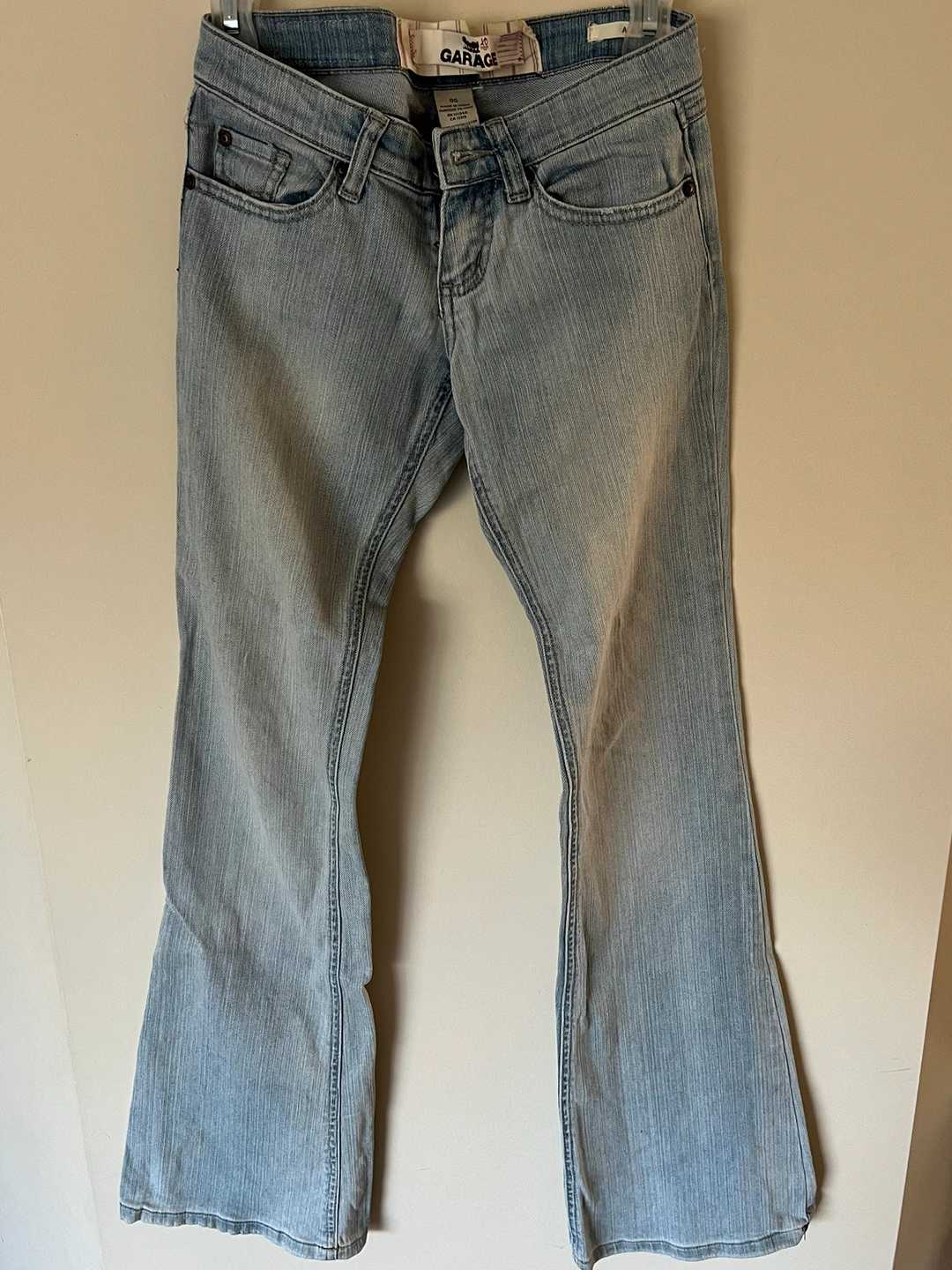 New Garage light blue washed denim. Size 00. These jeans have a relaxed fit with a flared hem. They feature a classic five-pocket design and a zip fly closure. 98% cotton and 2% spandex.