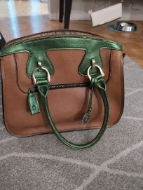 This is a brown and Metallic green handbag. It has two top handles and a top zipper closure. There's a small charm hanging from one of the handles. Comes with shoulder strap. Excellent condition - killer style.