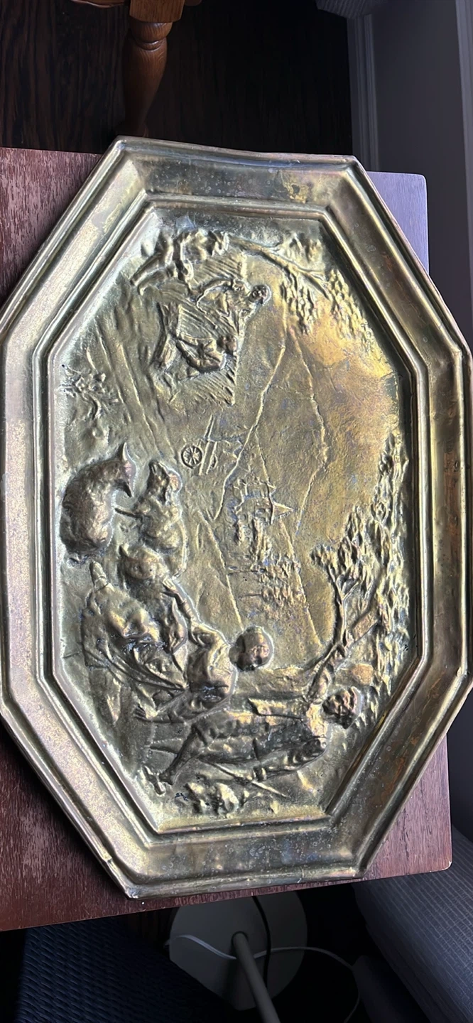 This is an octagonal brass tray featuring an embossed scene with figures and animals. It has a decorative, antique look. The material is brass. Measures 16 inches wide by 23 inches long