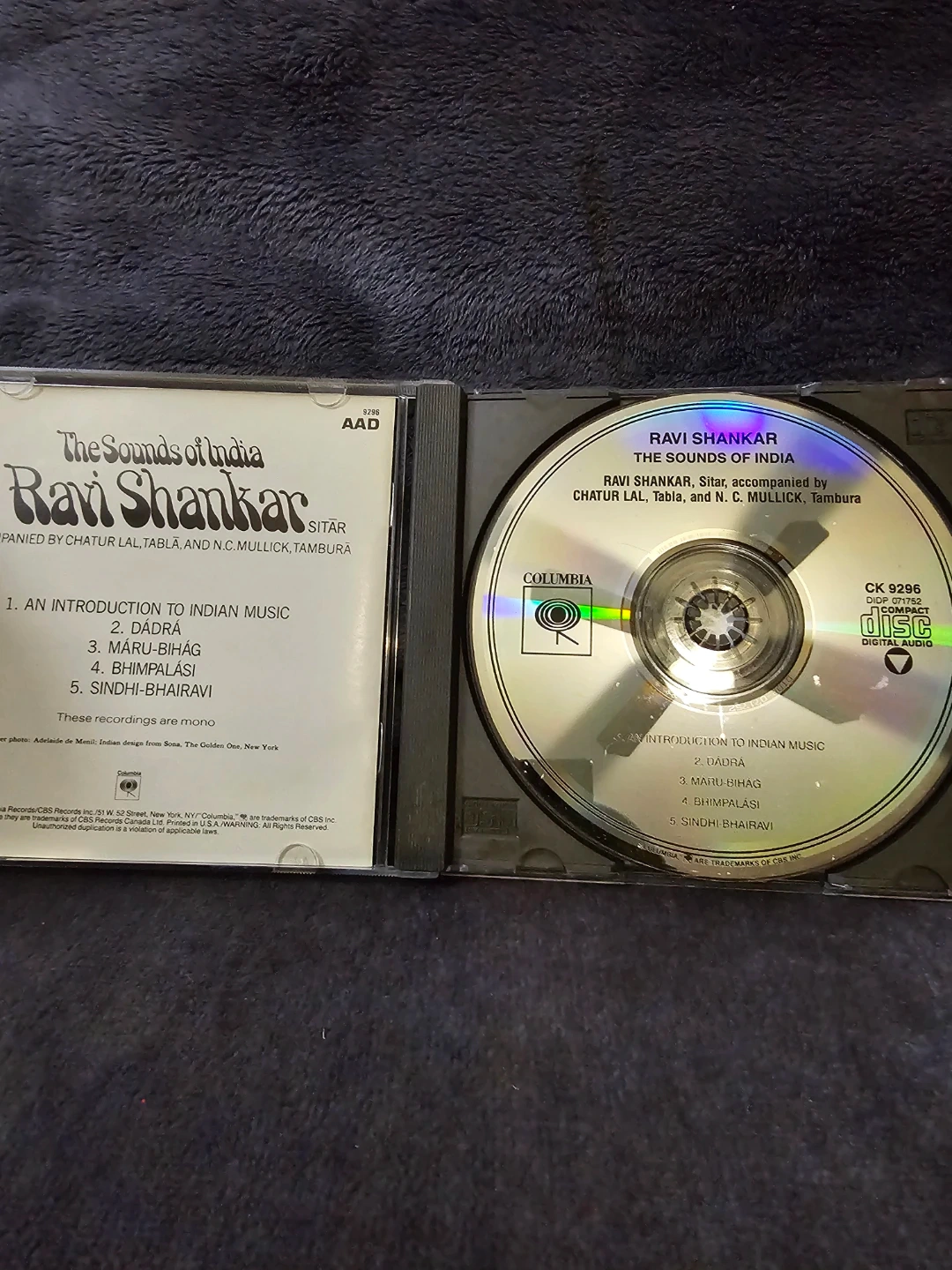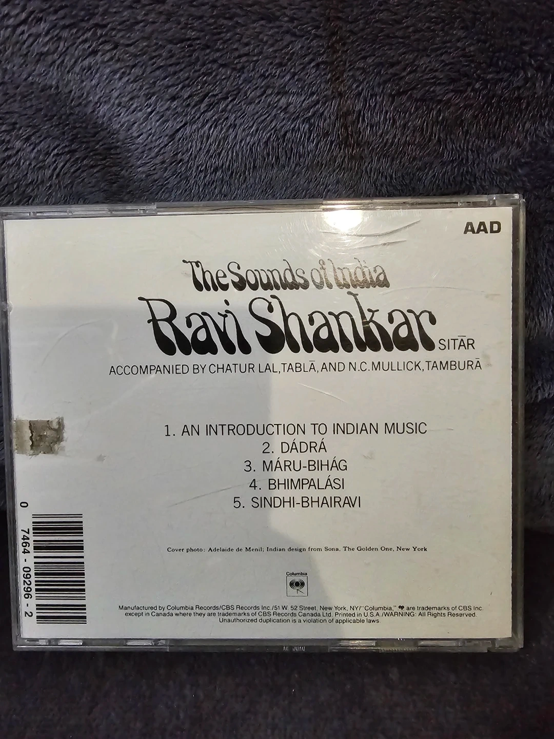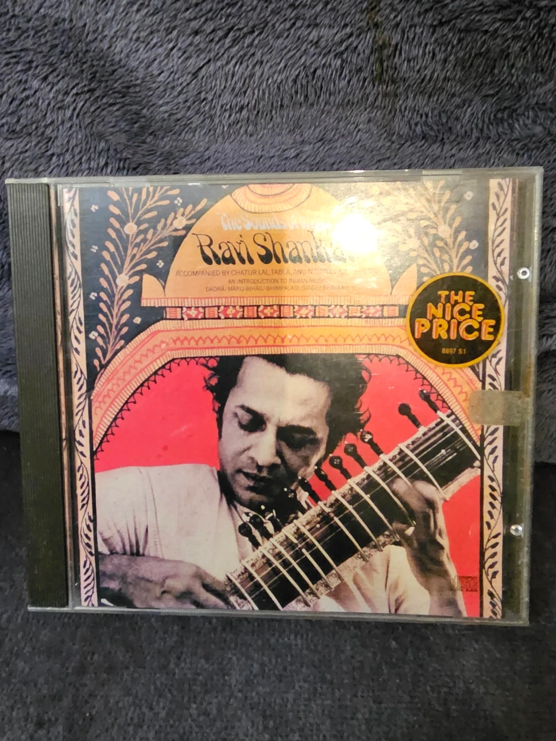Selling a Ravi Shankar CD, "The Sounds of India". It includes accompaniment by Chatur Lal, Tabla, and N.C. Mullick, Tambura. The CD features:
