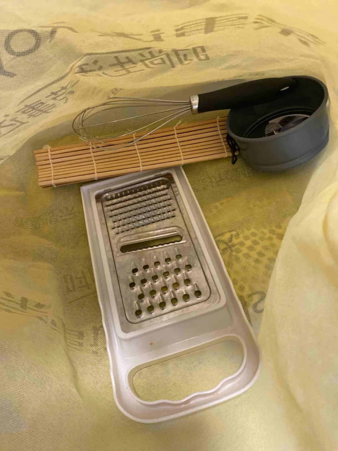 Selling a collection of kitchen utensils! Included are a grater with a white handle, a whisk with a black handle, a springform pan, and a bamboo mat. Great for all your cooking and baking needs