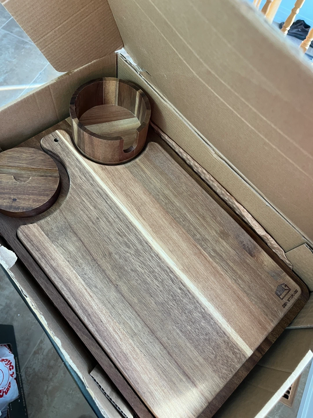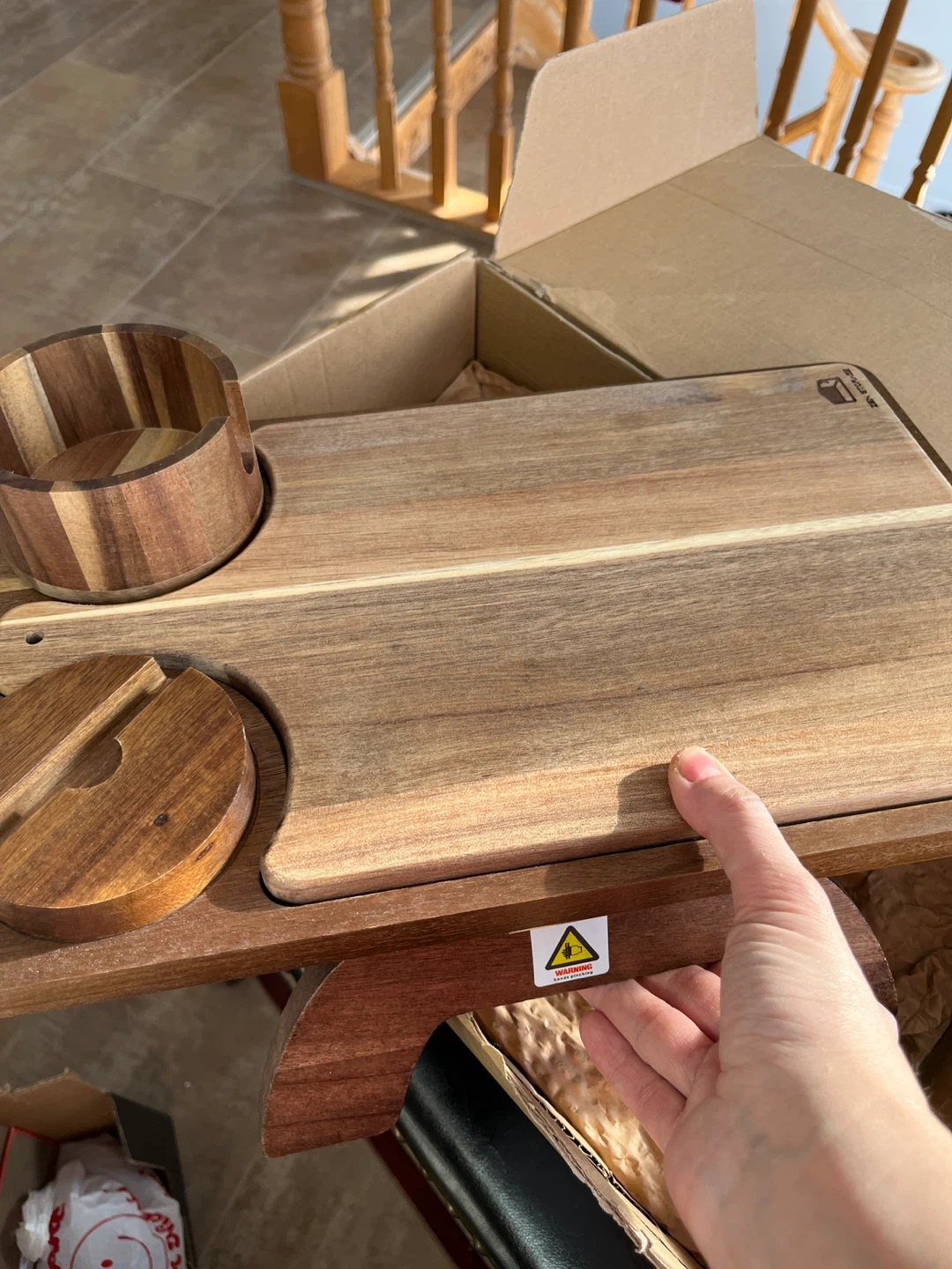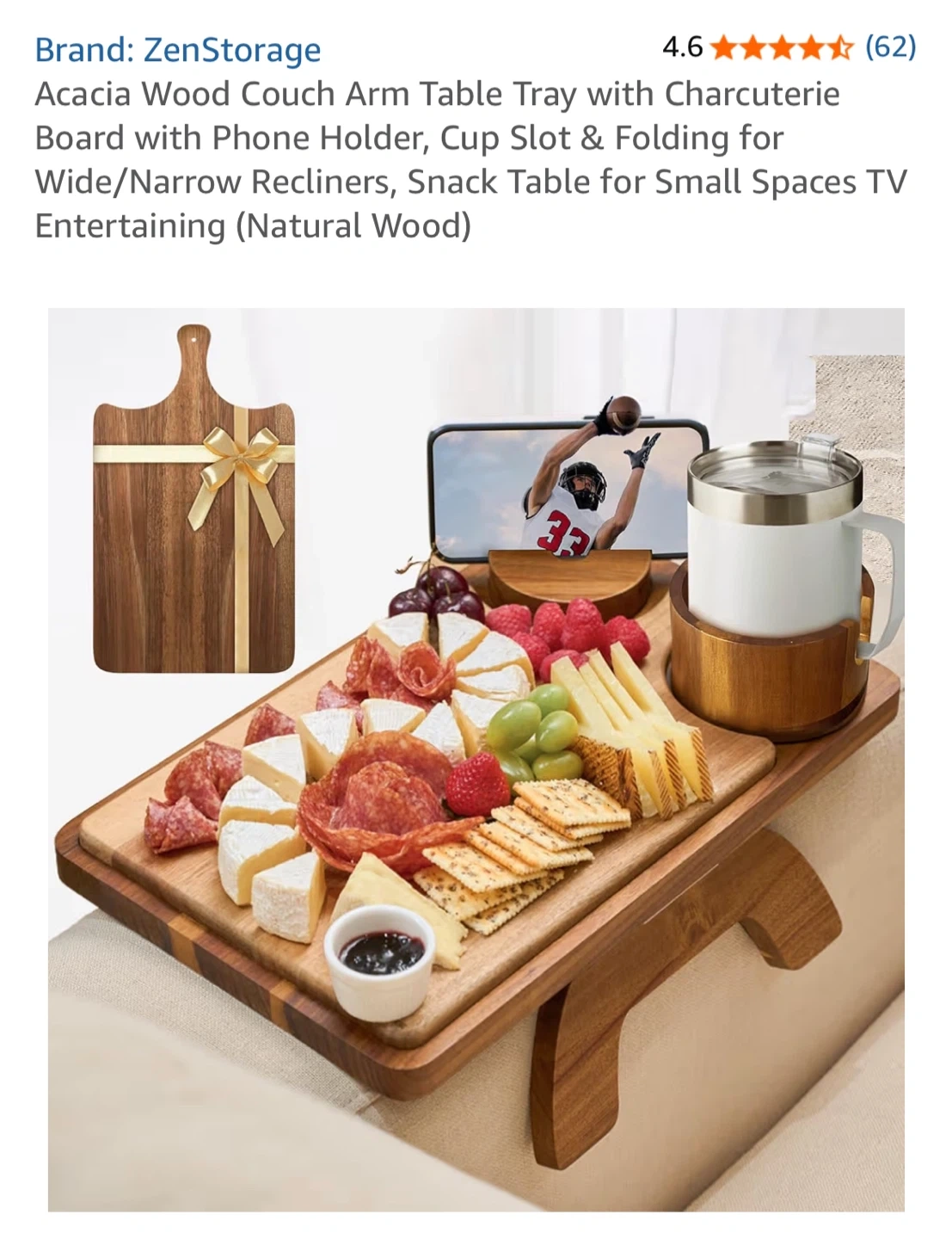 Selling a ZenStorage Acacia Wood Couch Arm Table! It comes in the original box and is perfect for wide or narrow recliners. It even has a phone holder and cup slot for enjoying snacks and TV. Great for small spaces!