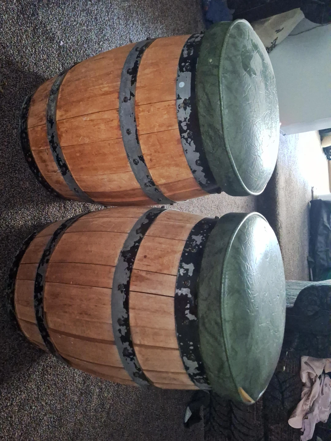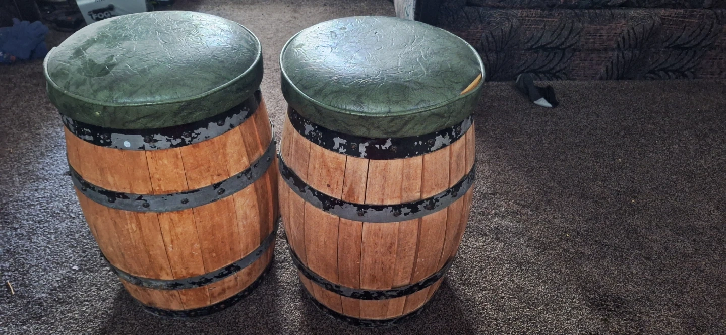 Selling a pair of barrel stools! They have a rustic, unique look that would be great for a home bar or rec room. The tops are padded for extra comfort. One stool has a small tear on the top.