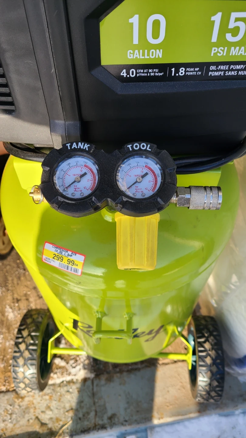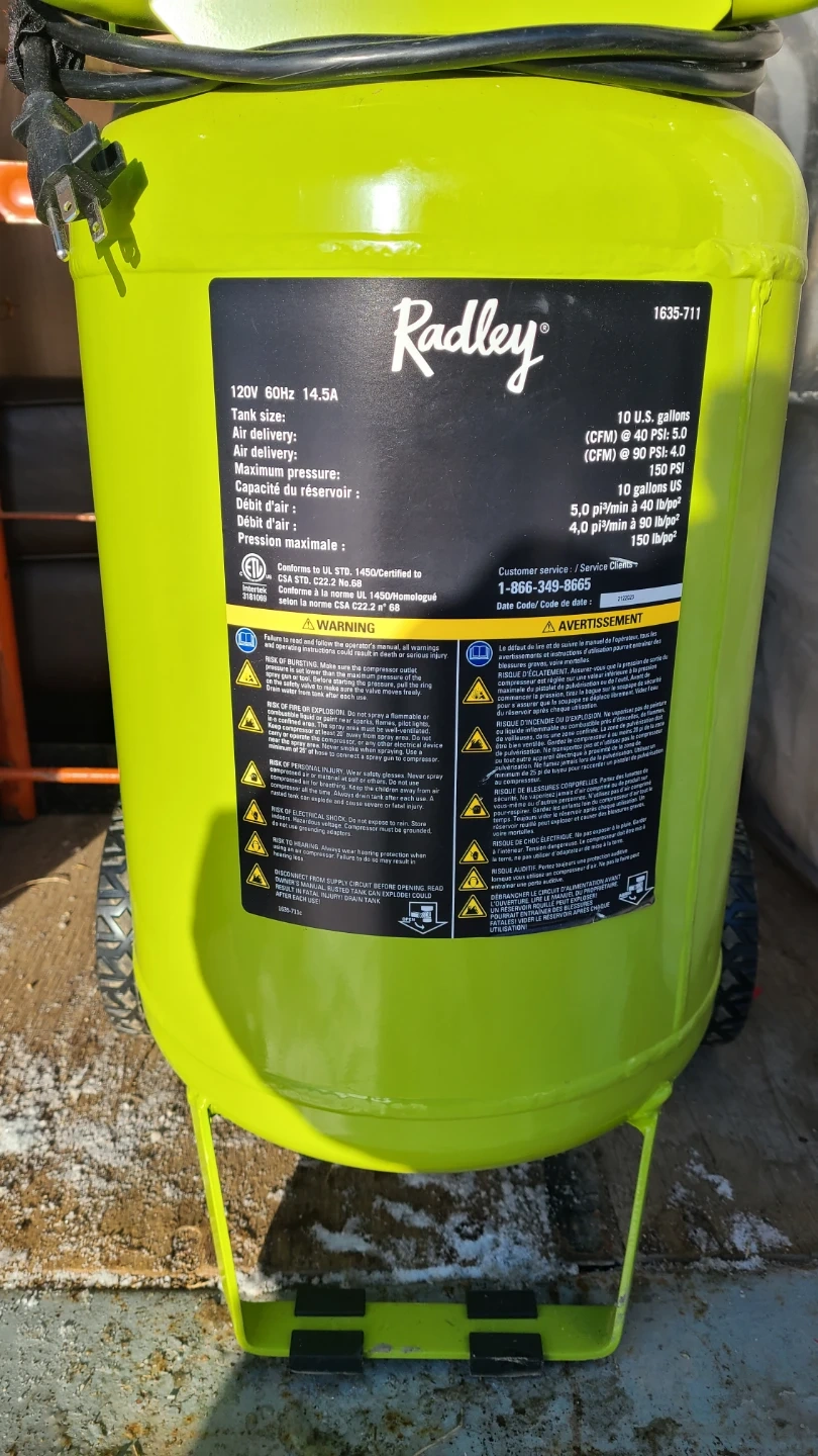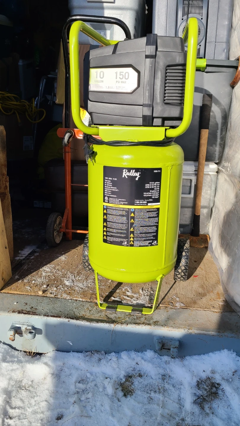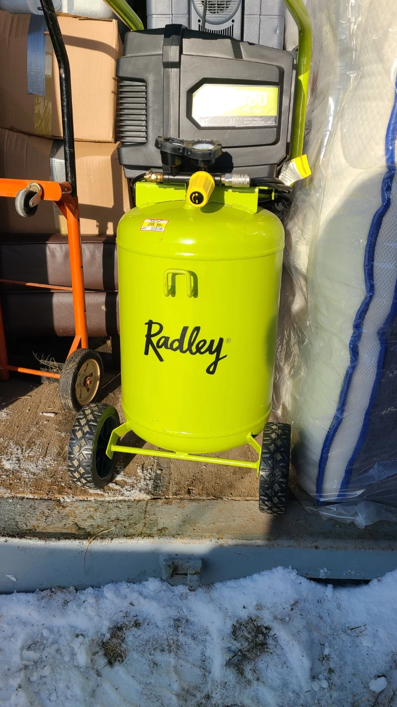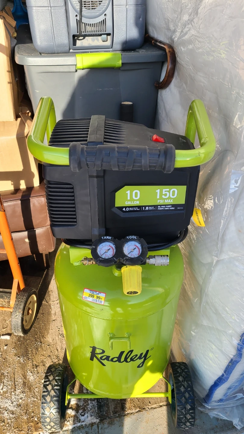 Selling a Radley 10-gallon air compressor in excellent condition! It features a 150 PSI max, 4.0 CFM at 90 PSI, and an oil-free pump. It was originally priced at $299.99.