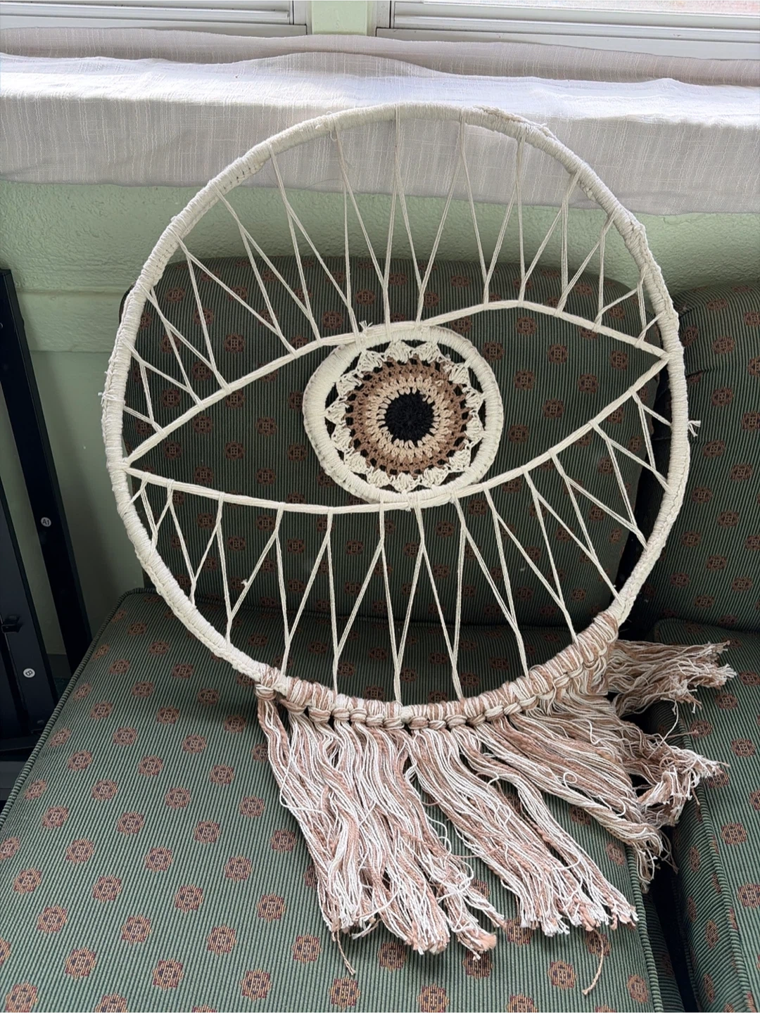 Selling a unique, handmade macrame wall hanging! This eye-shaped piece adds a bohemian touch to any room. It features intricate crochet detailing and a fringe trim. The neutral colors make it easy to match with any decor