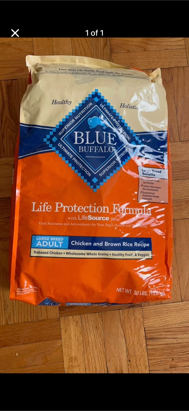 Blue Buffalo Life Protection Formula for large breed adult dogs! It's the Chicken and Brown Rice Recipe, and the bag weighs 30 lbs.