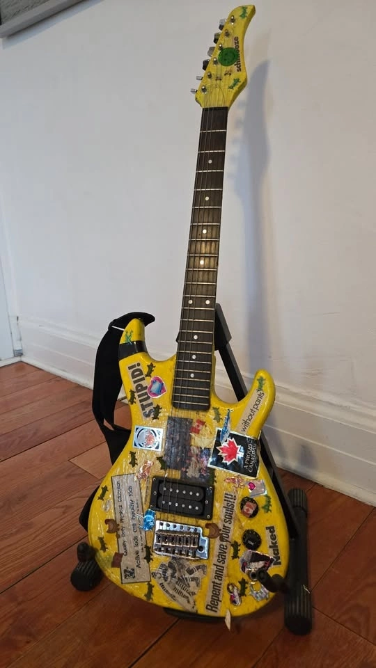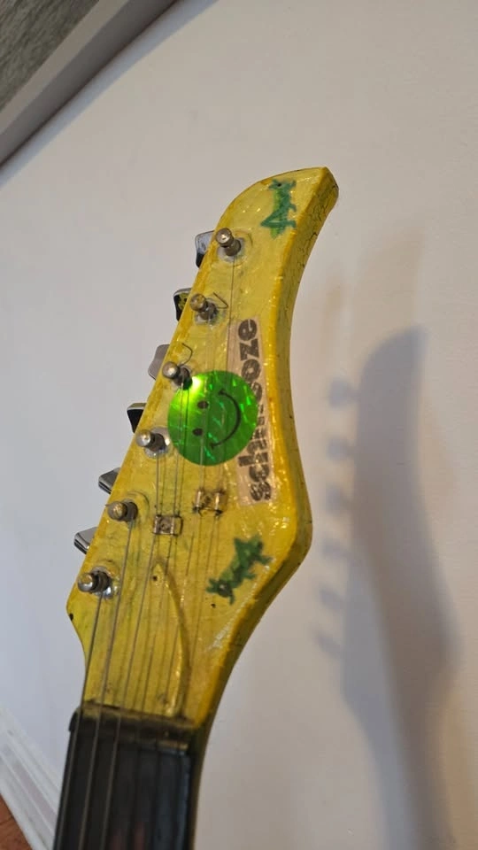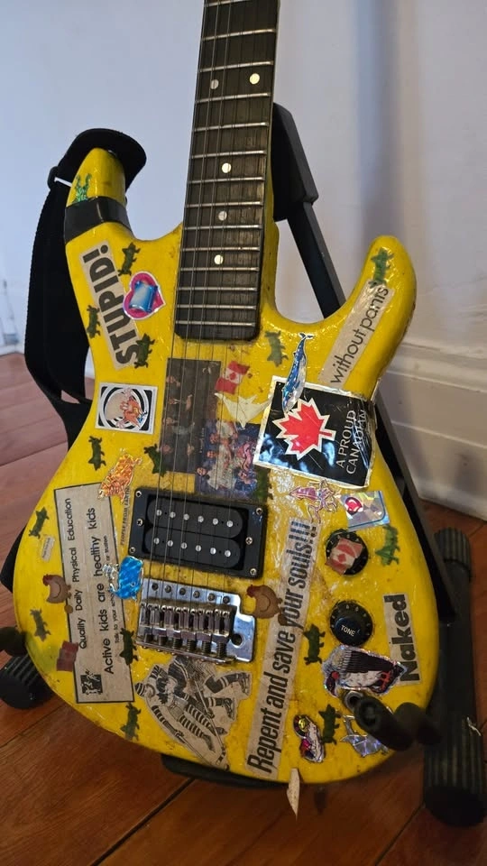 This is not your average guitar store find. It features a heavy yellow "crackle" finish, custom stickers, and a serious punk/grunge aesthetic. It looks like a "Super Strat" style body with dual humbucker pickups.