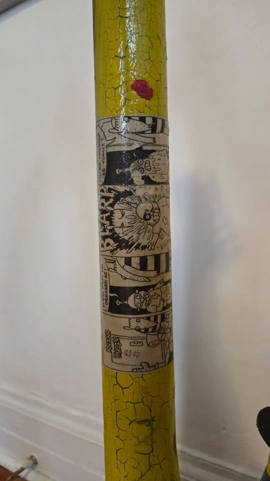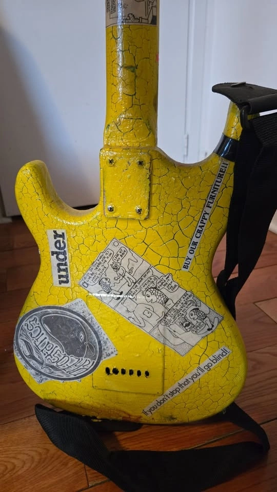 Finish: Custom distressed yellow with a cracked texture and comics/stickers on the back and neck.