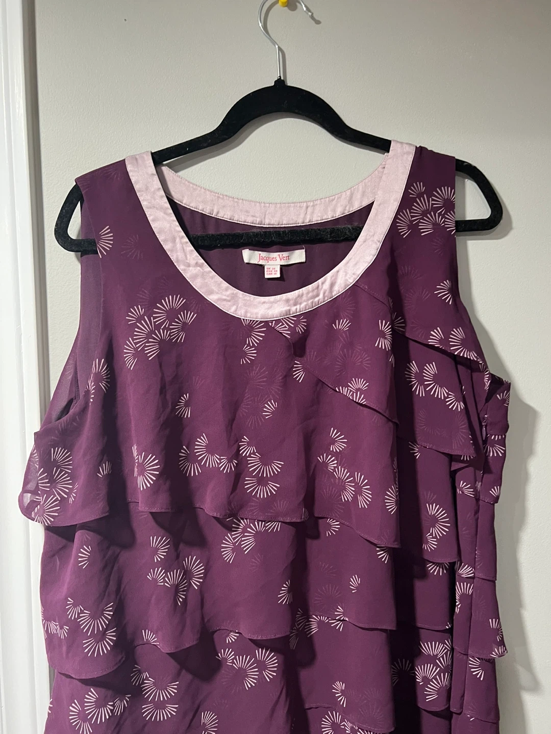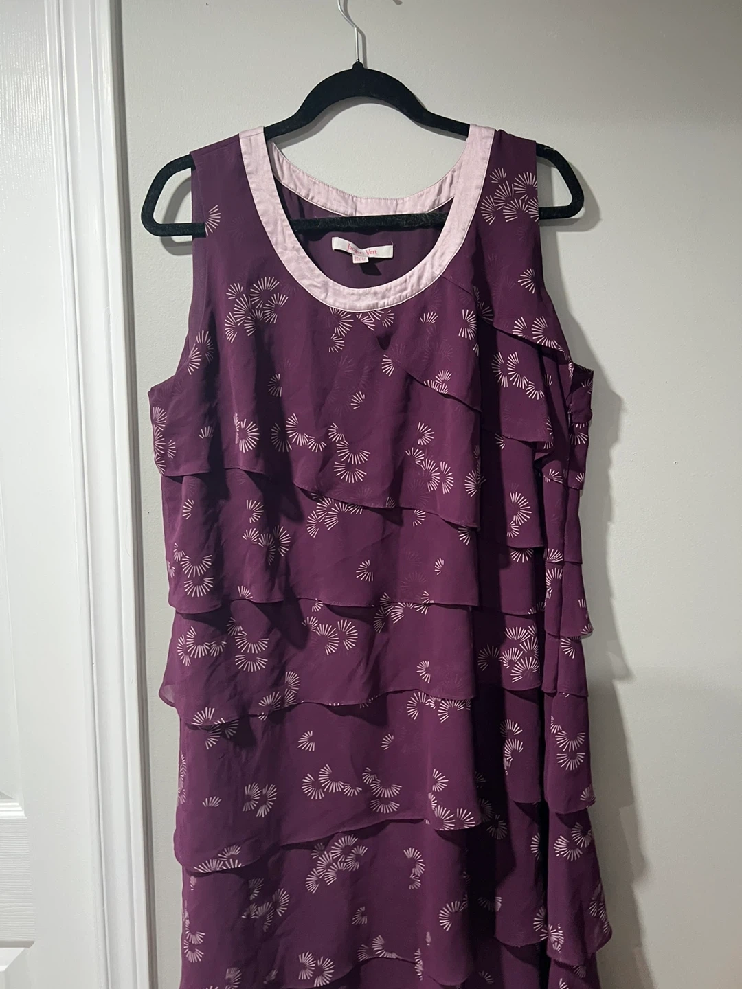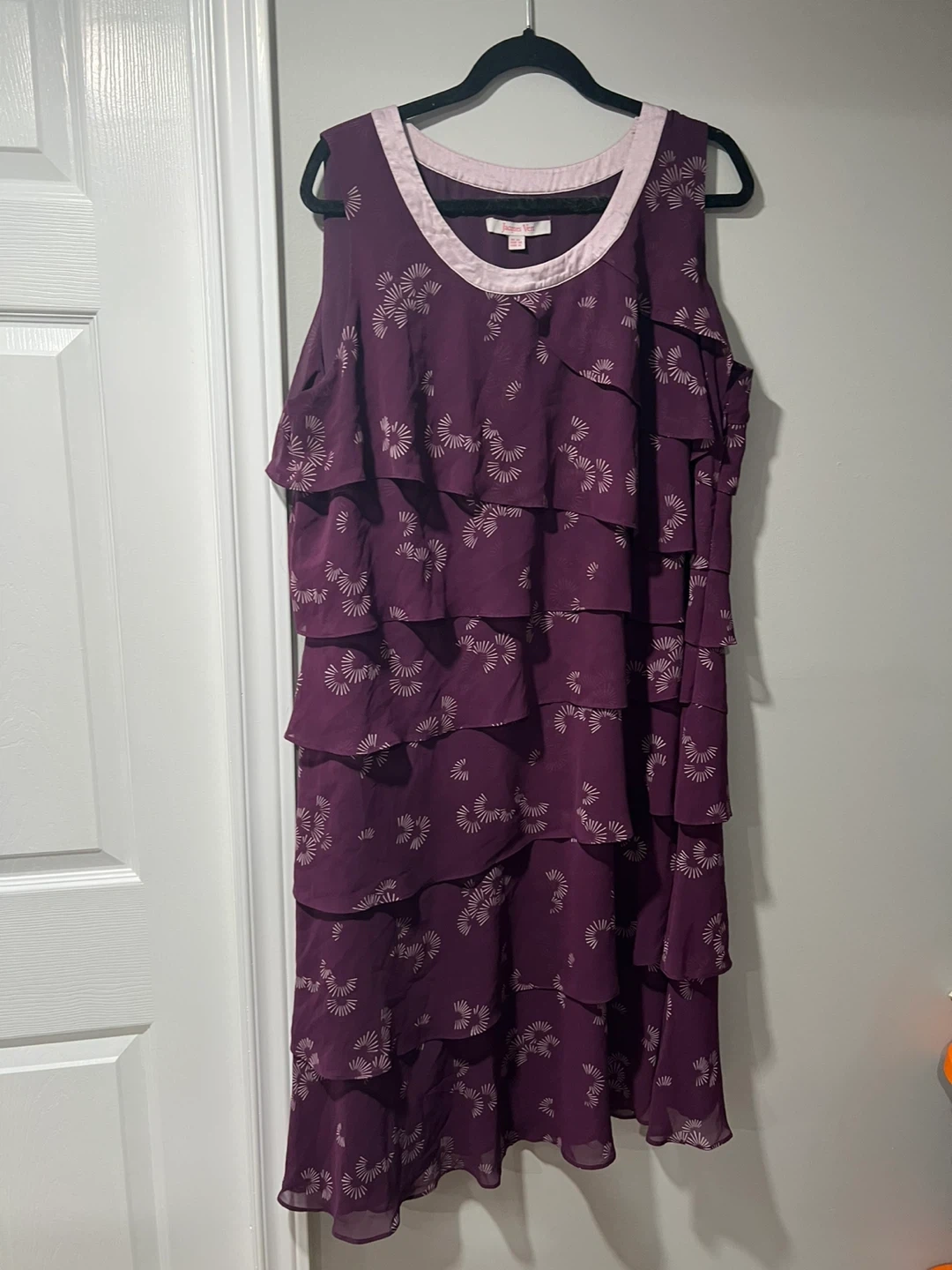 This is a lovely Jacques Vert dress in a beautiful shade of purple. It features a tiered design and is a size 16 (Canadian). The tag also shows UK size 20 and EUR size 48. It's in great condition and ready for a new owner!
