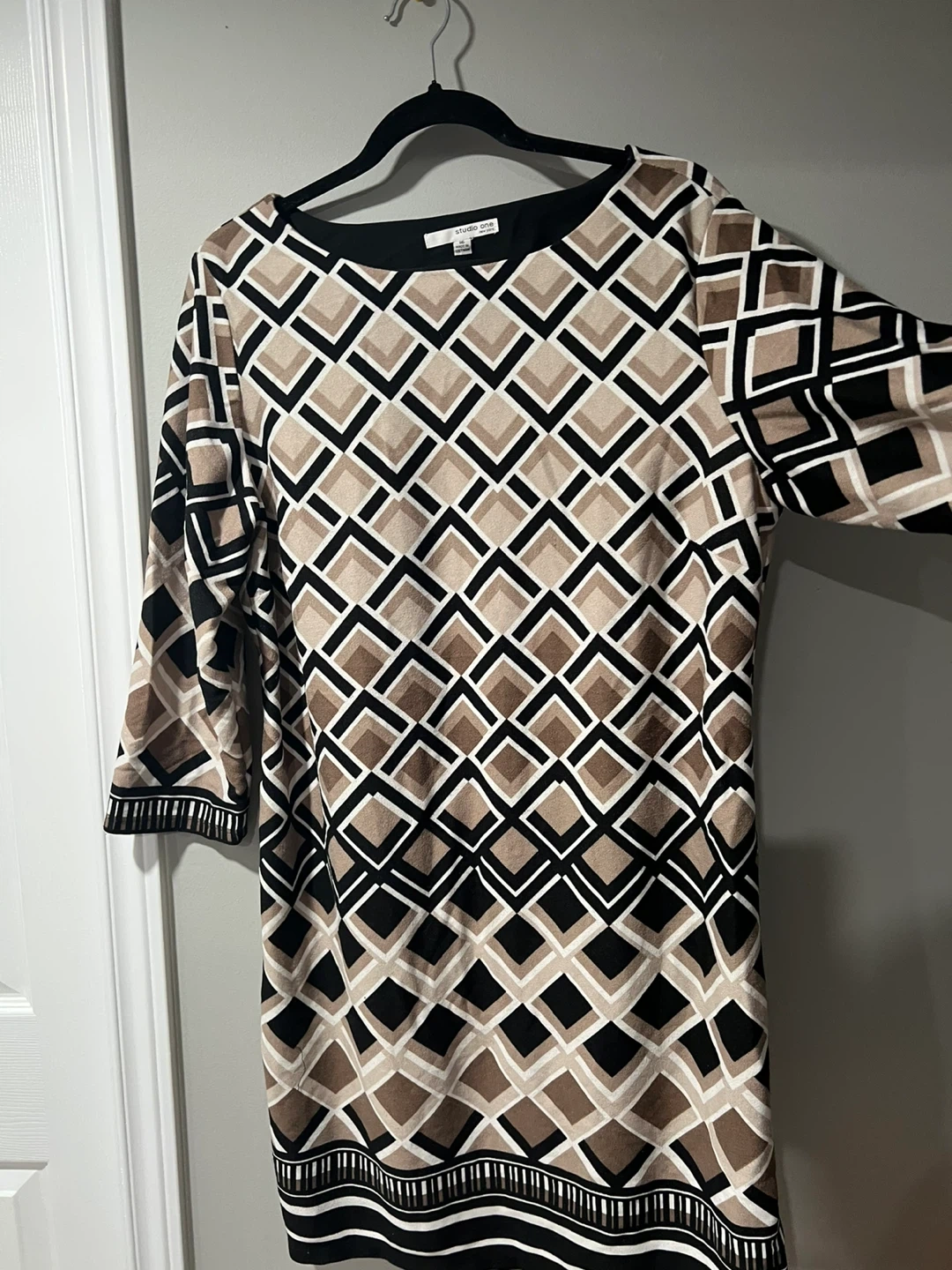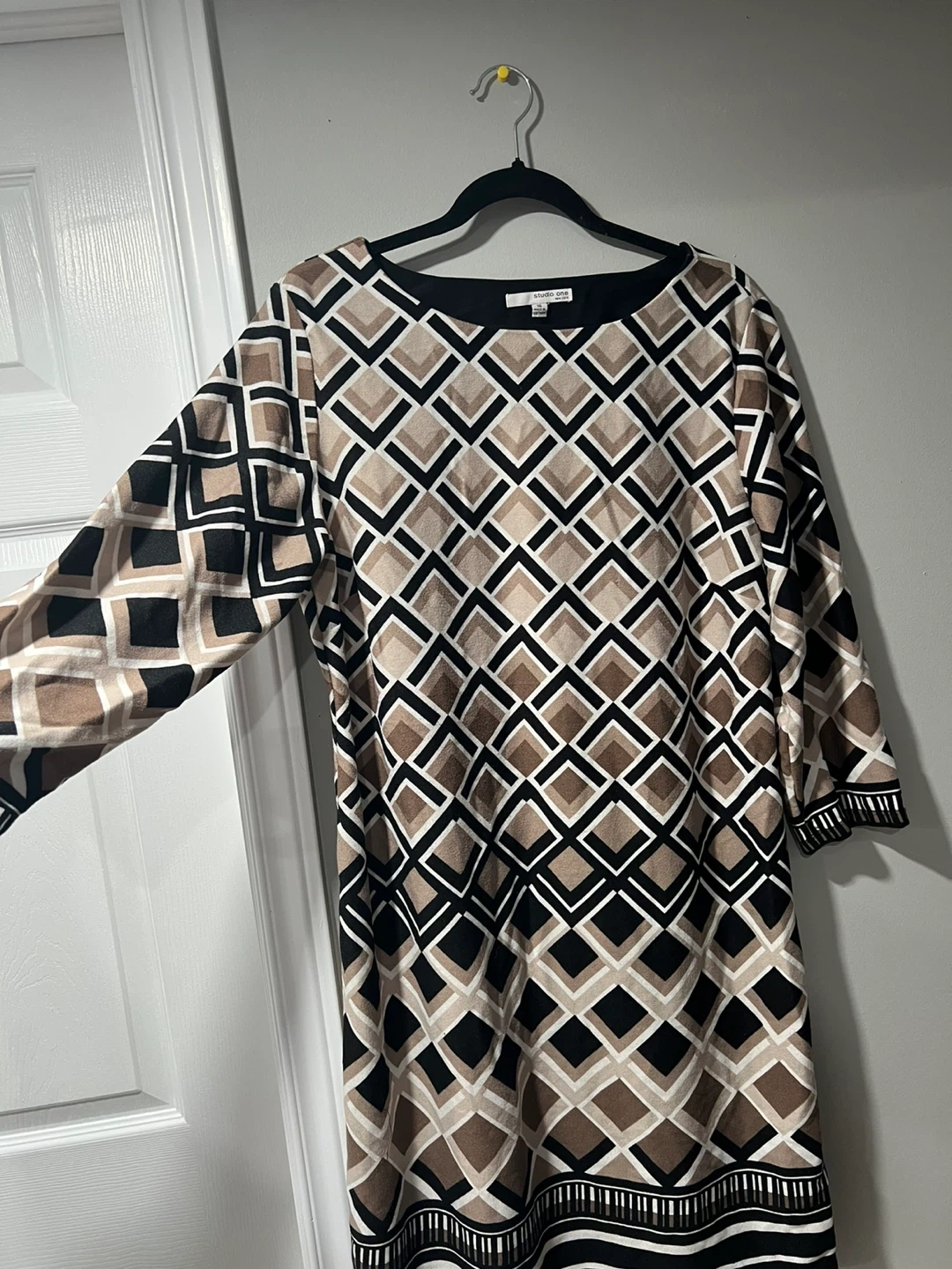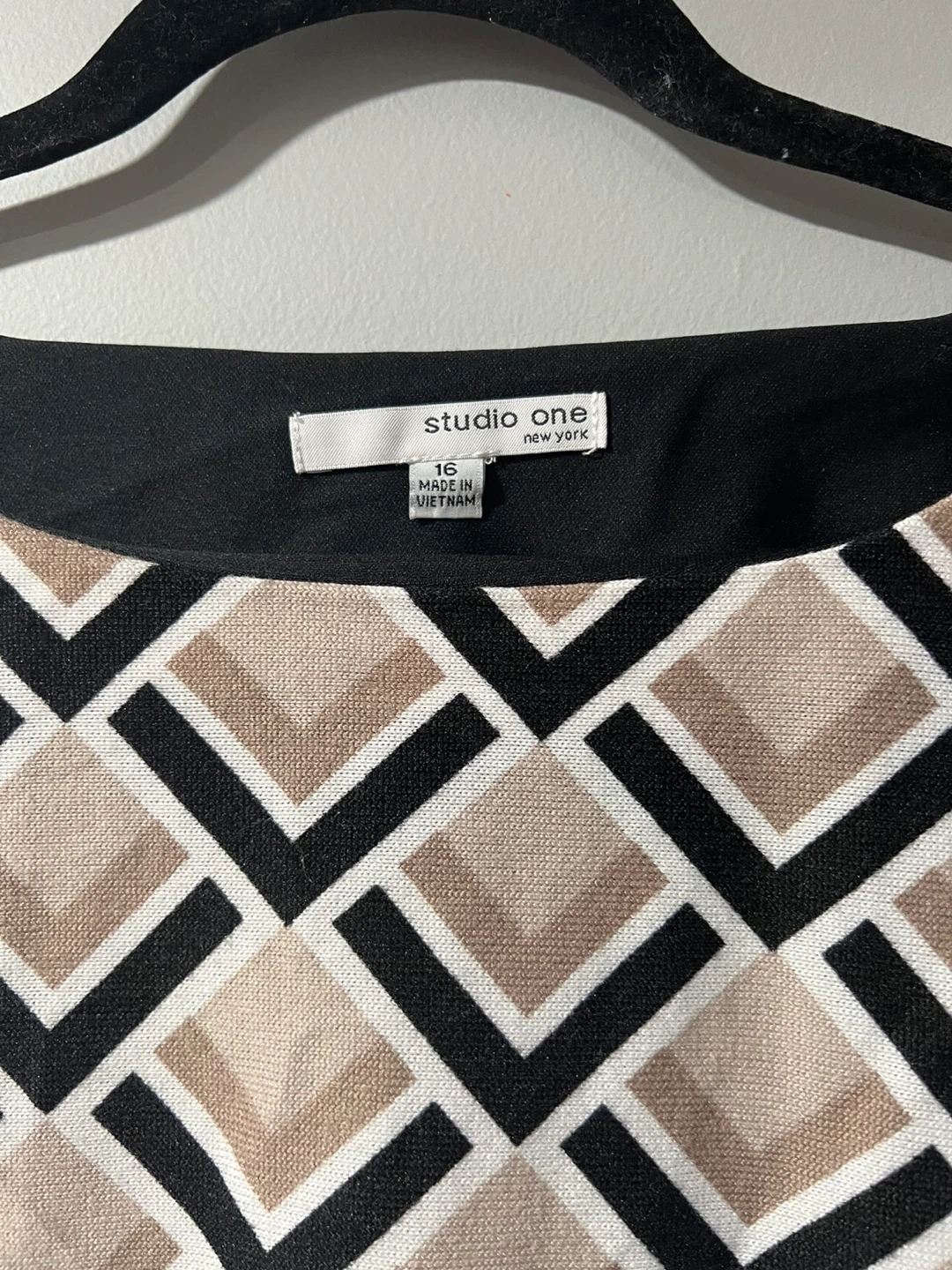 Studio One New York dress in size 16. It features a geometric pattern in black, brown, and beige tones. The dress has 3/4 sleeves and a round neckline. Perfect for work or a special occasion!
