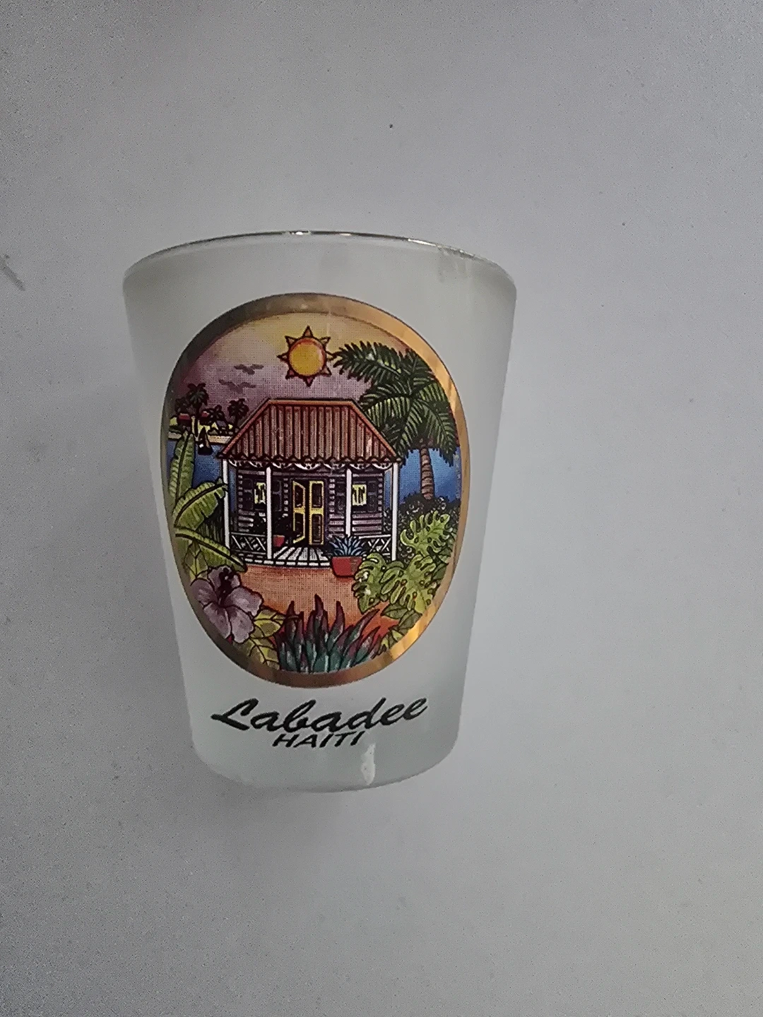 Selling a shot glass from Labadee, Haiti! It features a colourful scene with a house and palm trees. Great for collectors or as a souvenir