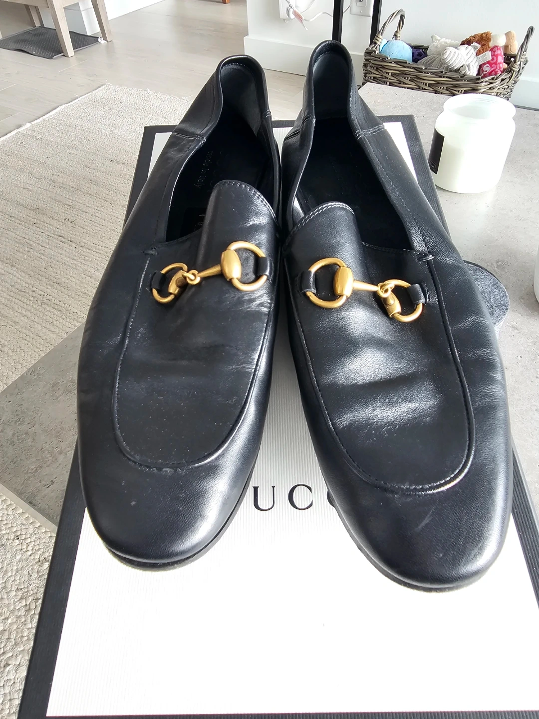 Selling a pair of Gucci leather horsebit loafers in size 7.5 mens. They are black and come with the original box and dust bag. These loafers are a classic and stylish addition to any wardrobe!