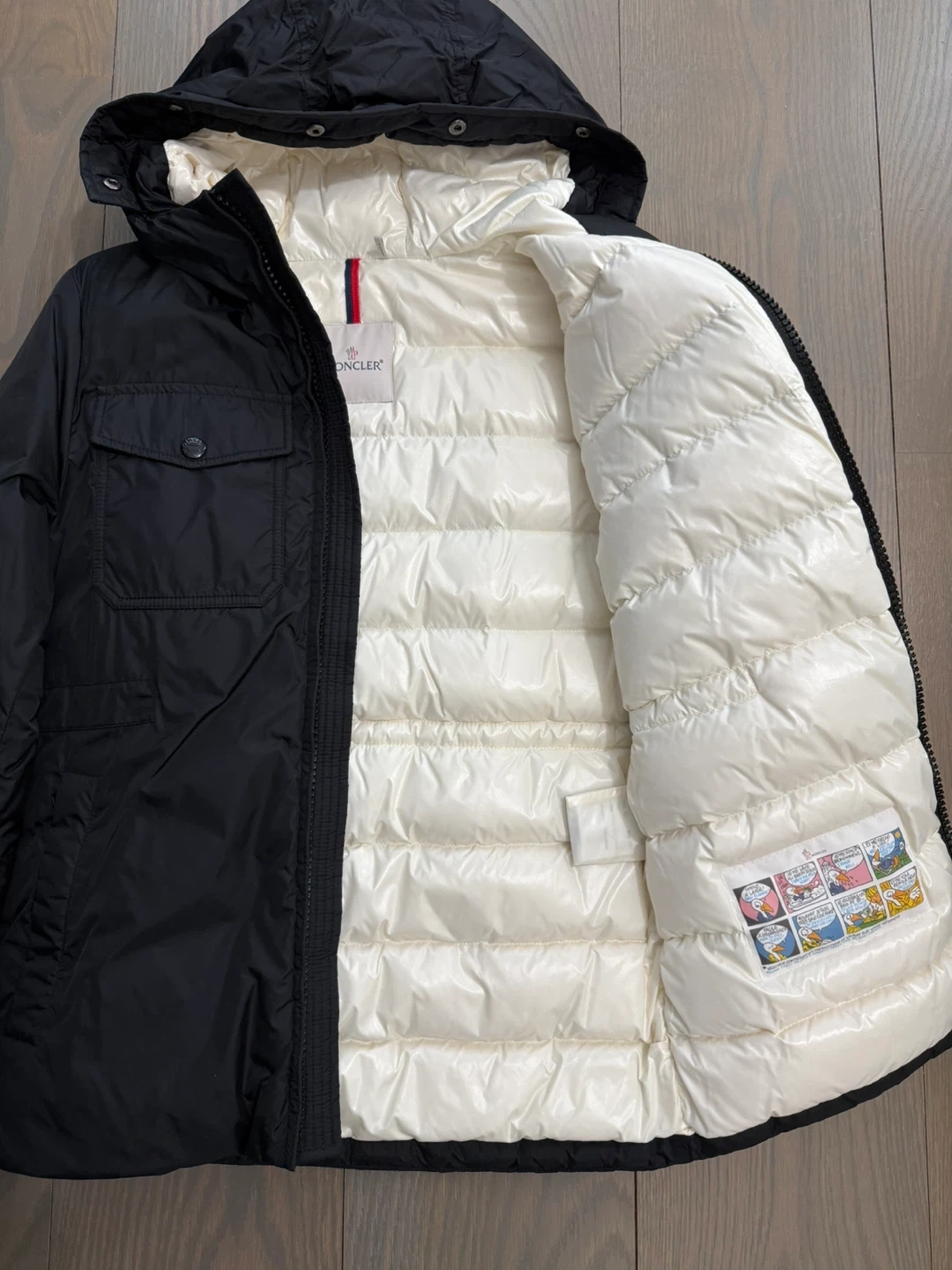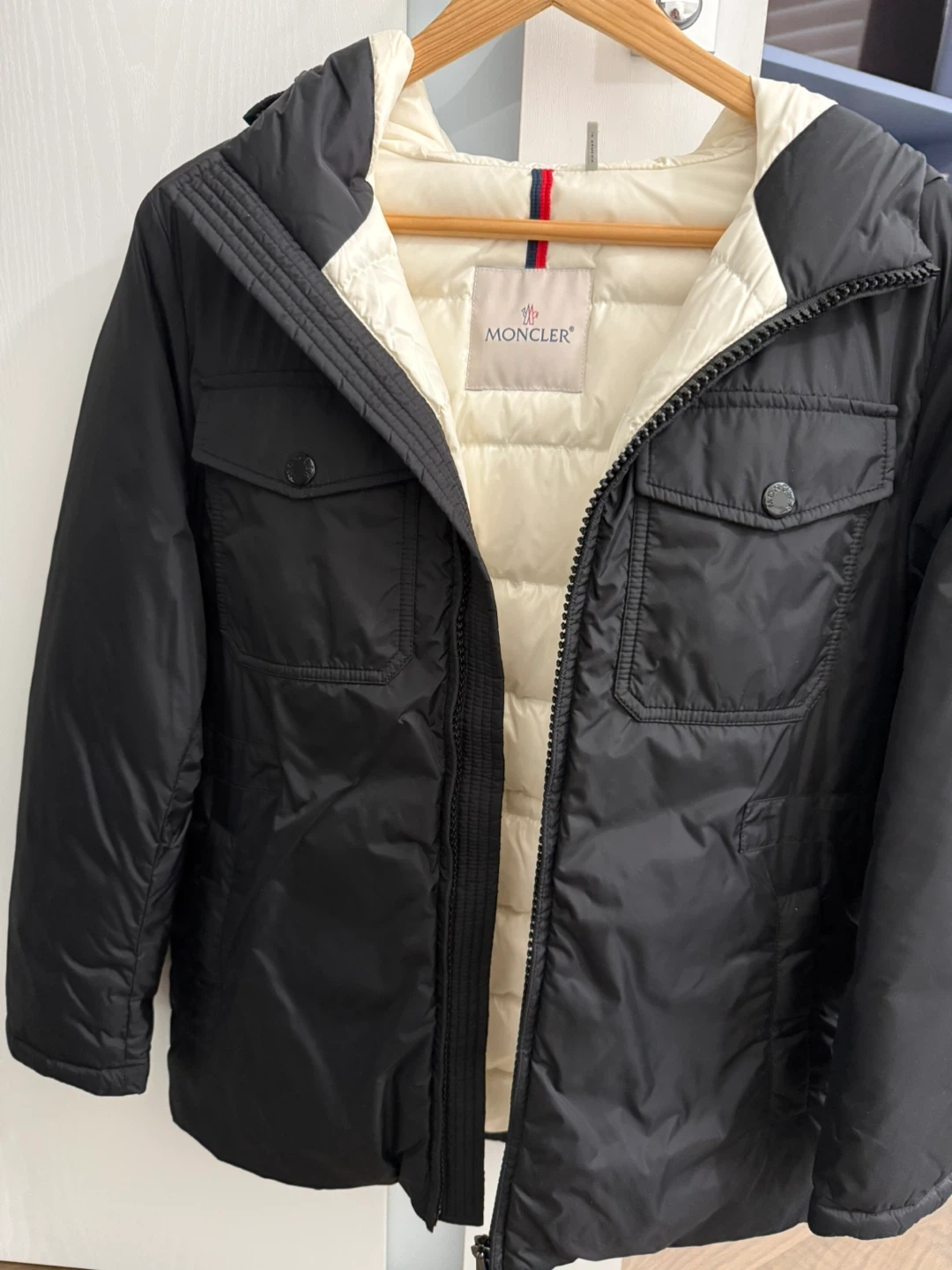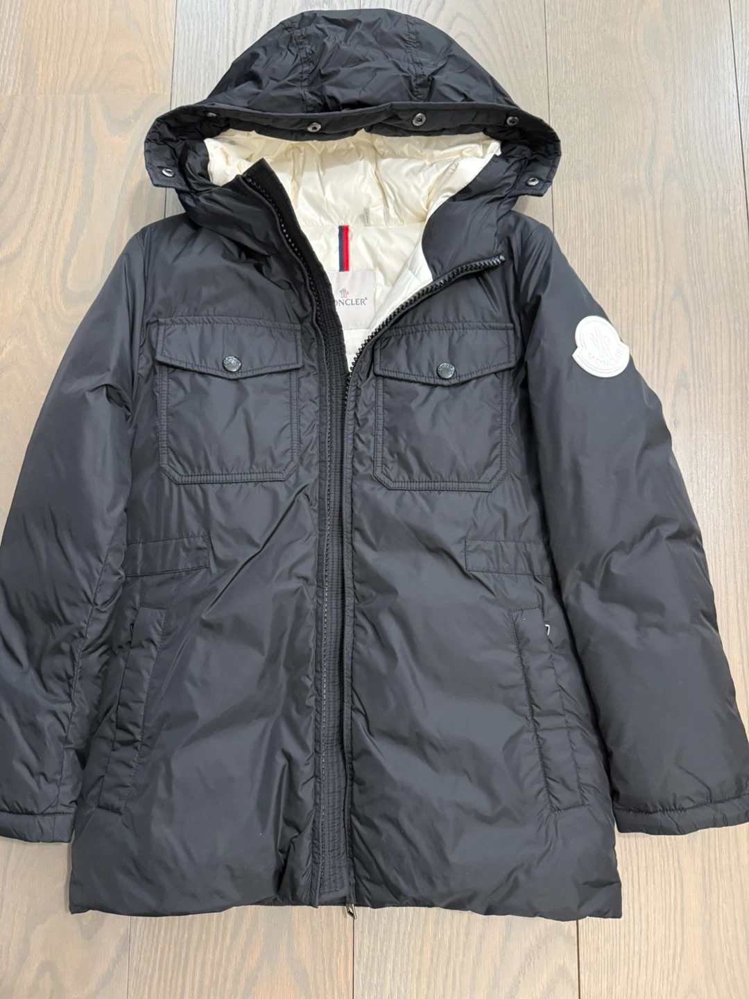 Selling a stylish Moncler long black padded hooded jacket. It's in great condition and ready to keep you warm! The jacket features a sleek black exterior with a contrasting white interior. Perfect for those cooler days!