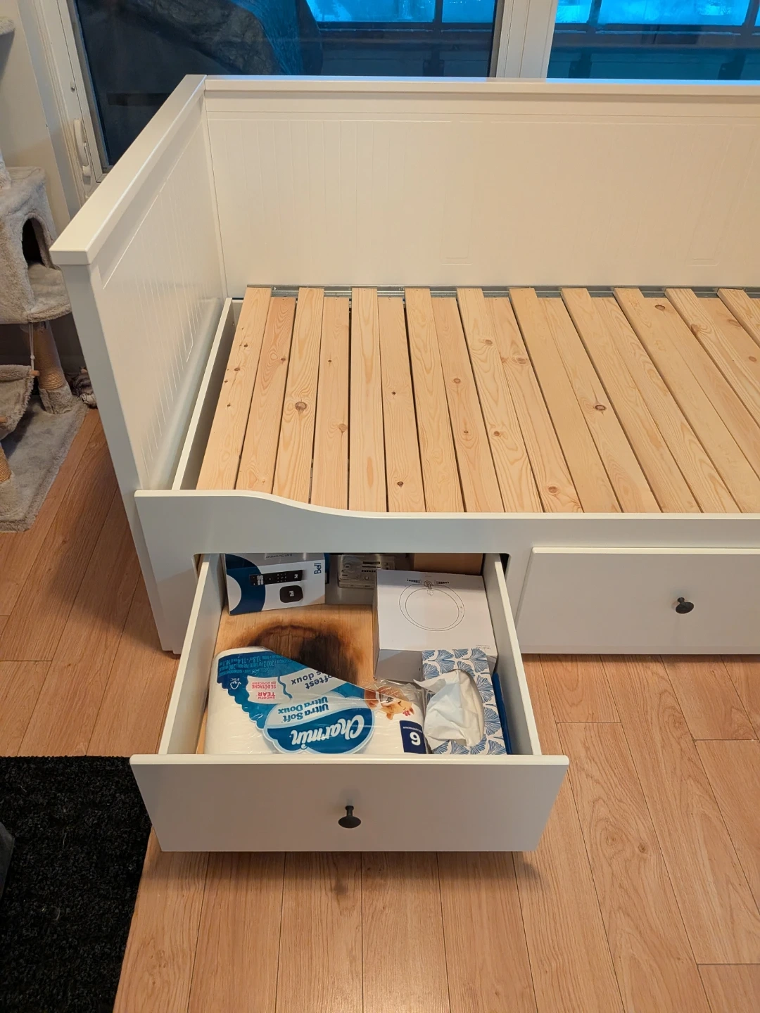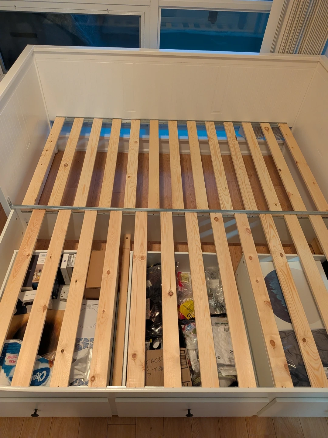 Selling an Ikea HEMNES daybed that's in great condition! It features a white finish and handy storage drawers underneath. Perfect for a guest room or a cozy spot to relax in your living space. The wooden slats provide excellent support for your mattress too!