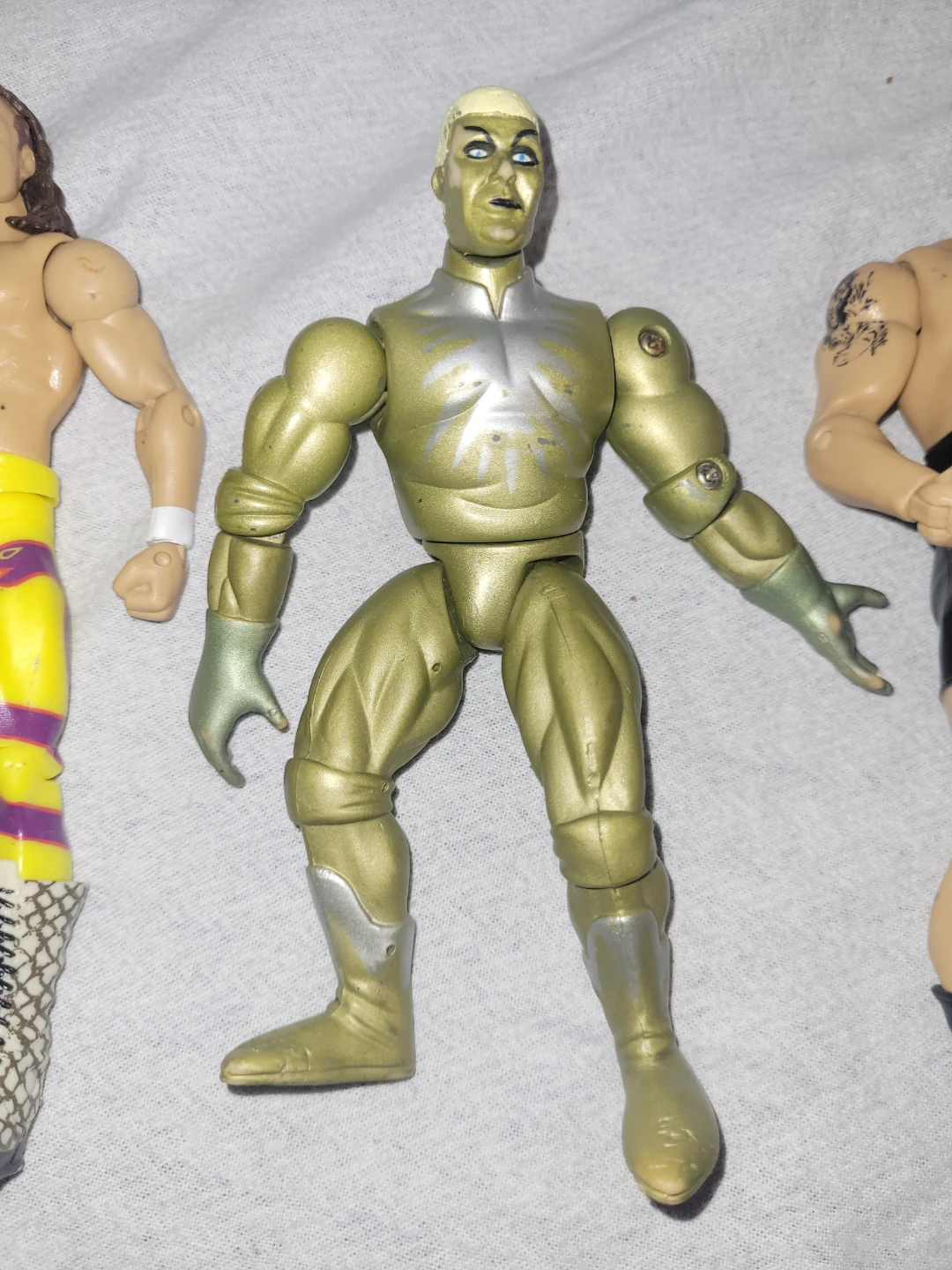 Up for grabs is a collection of WWE wrestling figures and accessories, ready to rumble into your collection! This set features 2 handless wrestlers and accessories, perfect for recreating epic battles or starting a new wrestling saga. The figures are used and show some signs of wear, but they're still full of character and ready for action. I'm looking to pass these on to a true wrestling fan. These figures have been well-loved, and while they aren't in mint condition, they're eager to jump back into the ring. You might notice a scuff here or there,and missing hands but that just adds to their battle-hardened charm. They're looking for a new home where they can continue their wrestling adventures. If this ad is still posted, the bundle is available and ready to go!