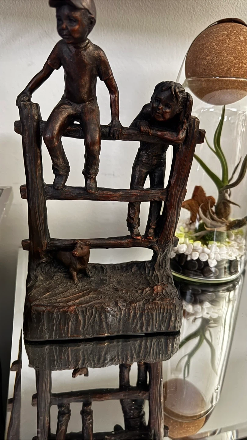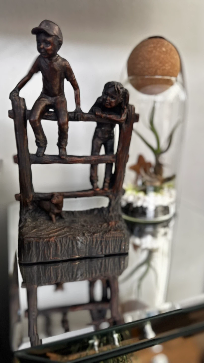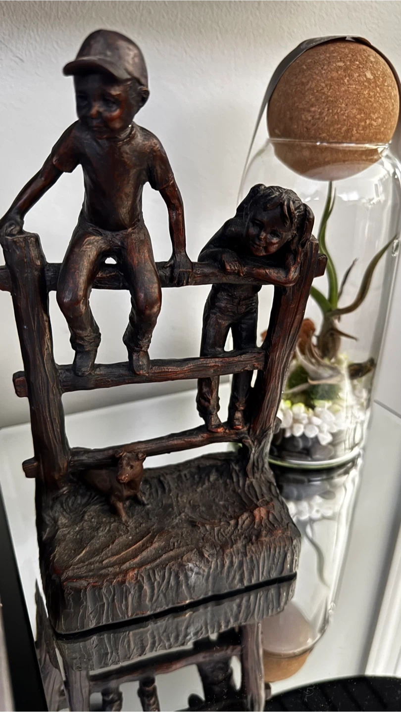 This is a vintage figurine of a boy and girl on a fence. It is made of a dark brown material and has a rustic look. It would be a great addition to any collection or as a decorative piece in your home