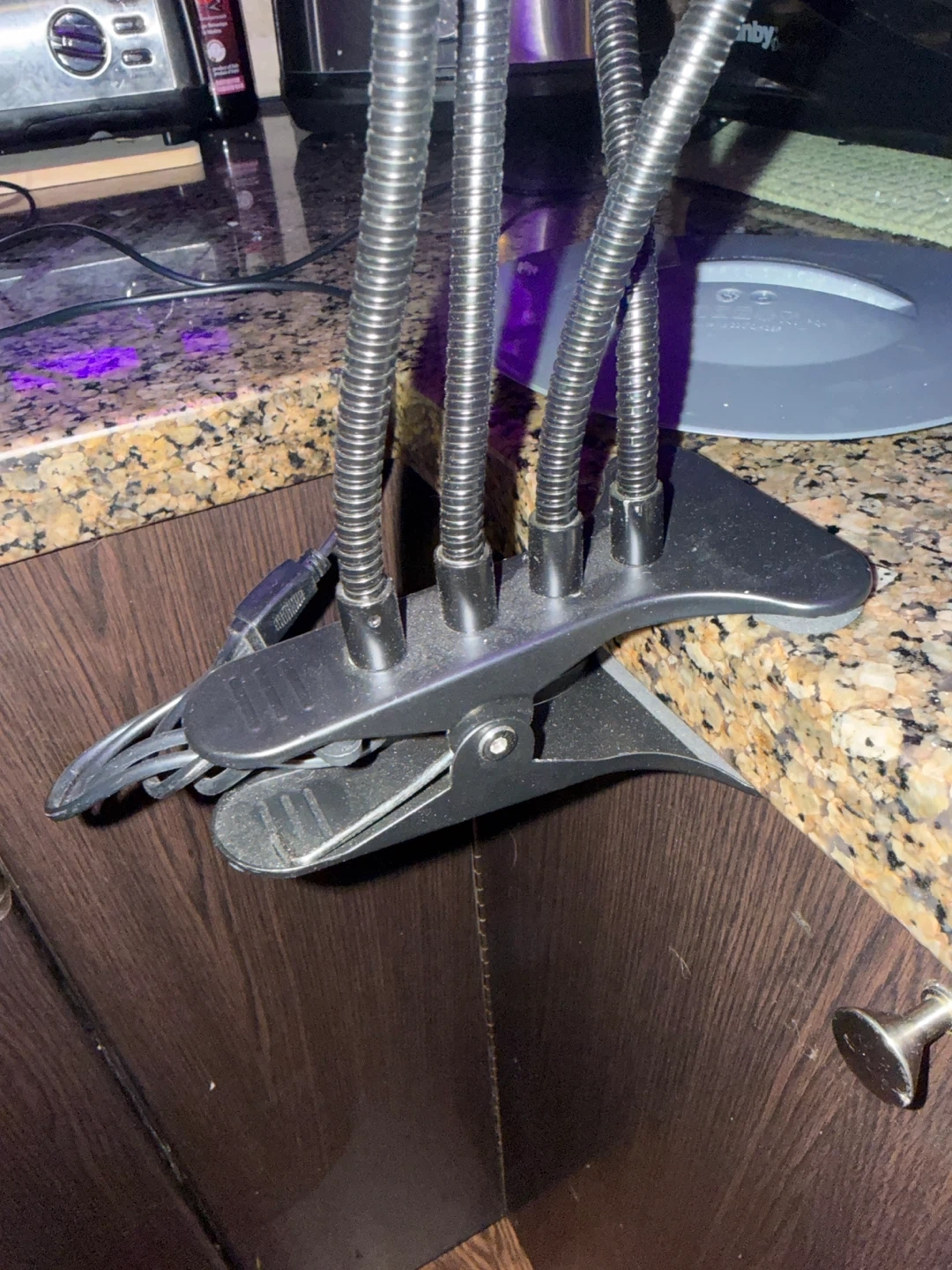 I'm selling an LED grow light with a stand. It features multiple flexible gooseneck lamps that can be adjusted to direct light where needed. The light has different settings, including red and blue light, to promote plant growth. It also comes with a clip for easy attachment to various surfaces.