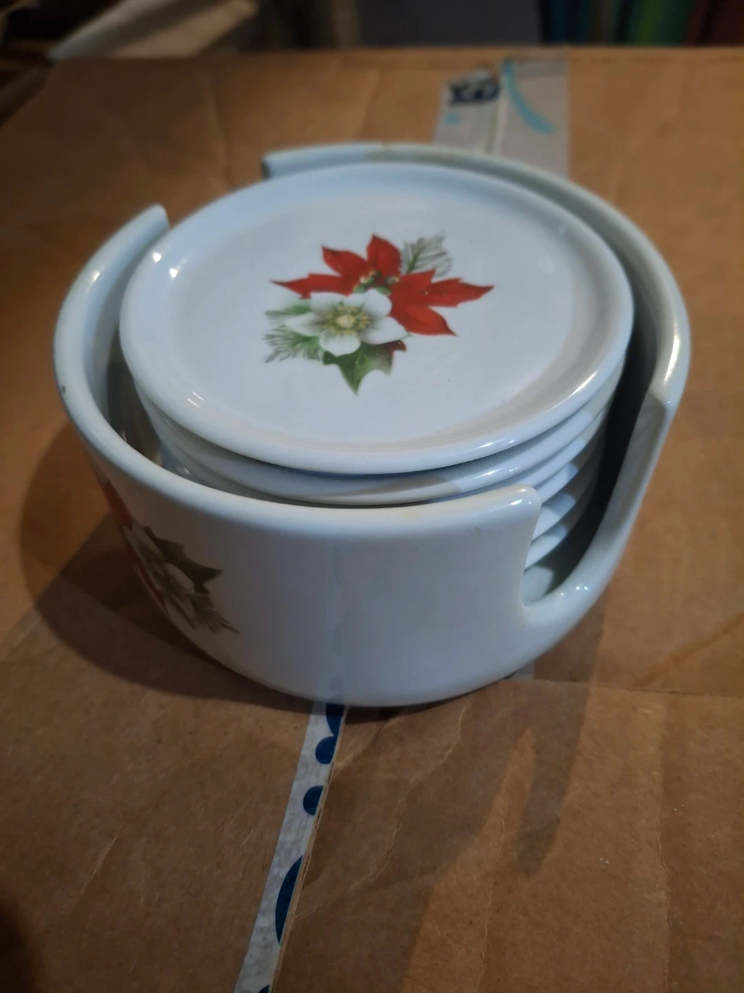 Selling a set of vintage coasters with a lovely poinsettia design. These coasters come with a matching holder, perfect for keeping your table tidy and adding a touch of retro charm to your home decor. They're in great shape and ready to protect your surfaces in style!