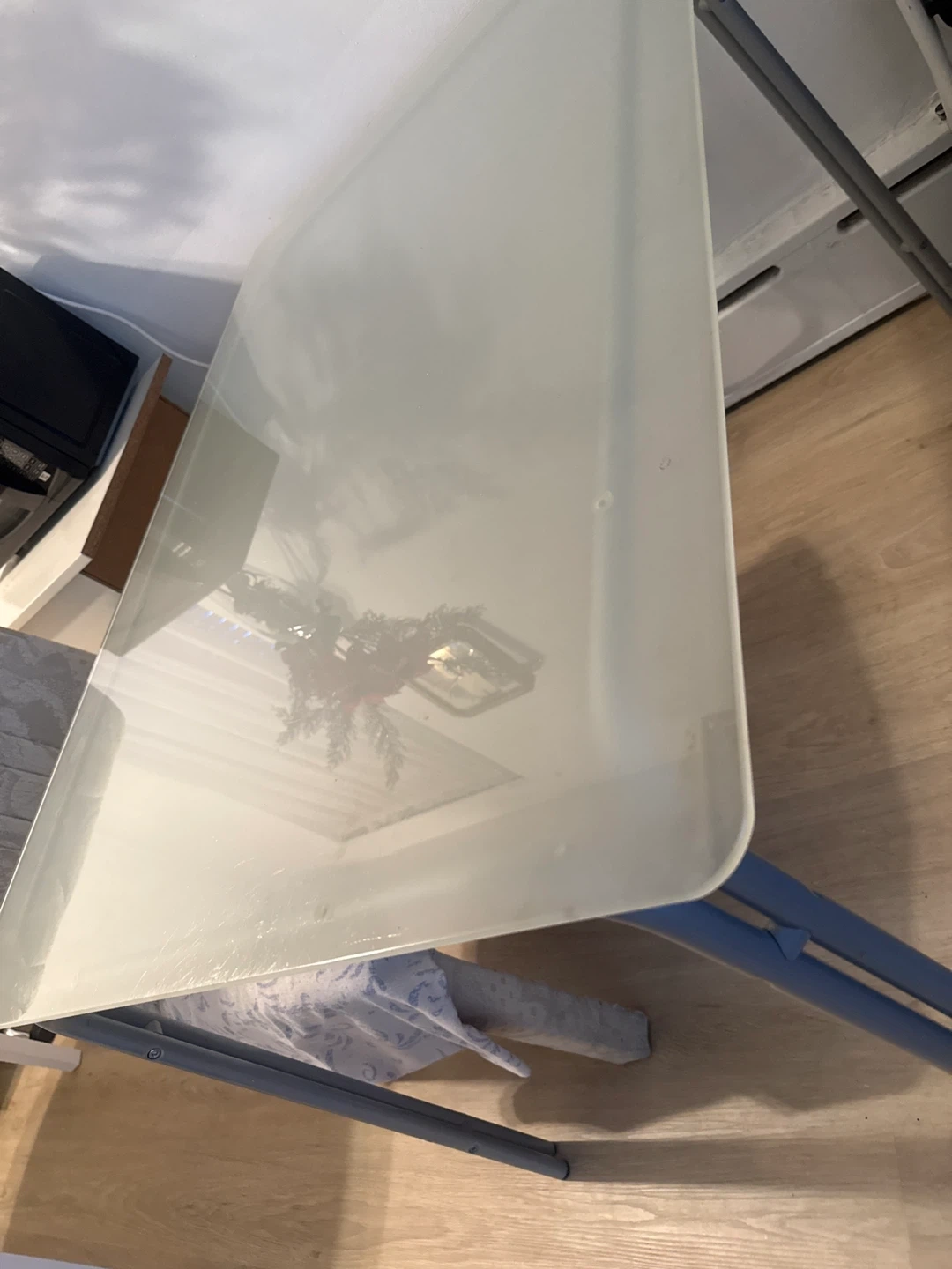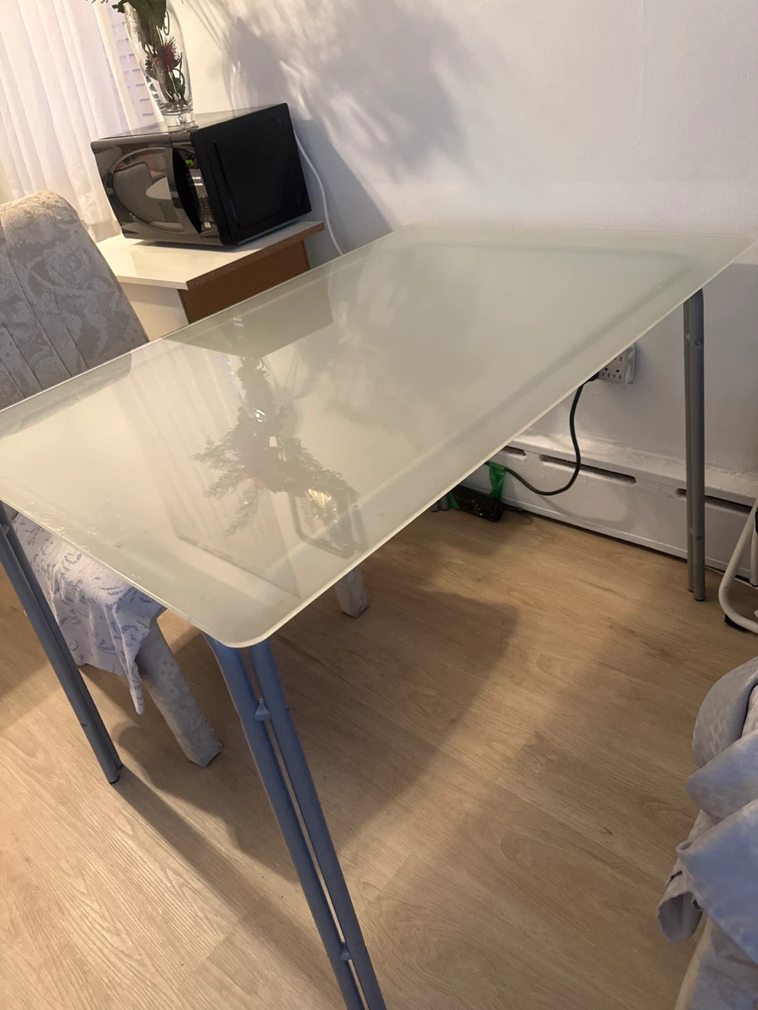 Selling a table with a white glass top. It has a simple, clean look that would fit well in a variety of spaces. The frame appears to be made of metal. It's in good condition and ready for a new home!