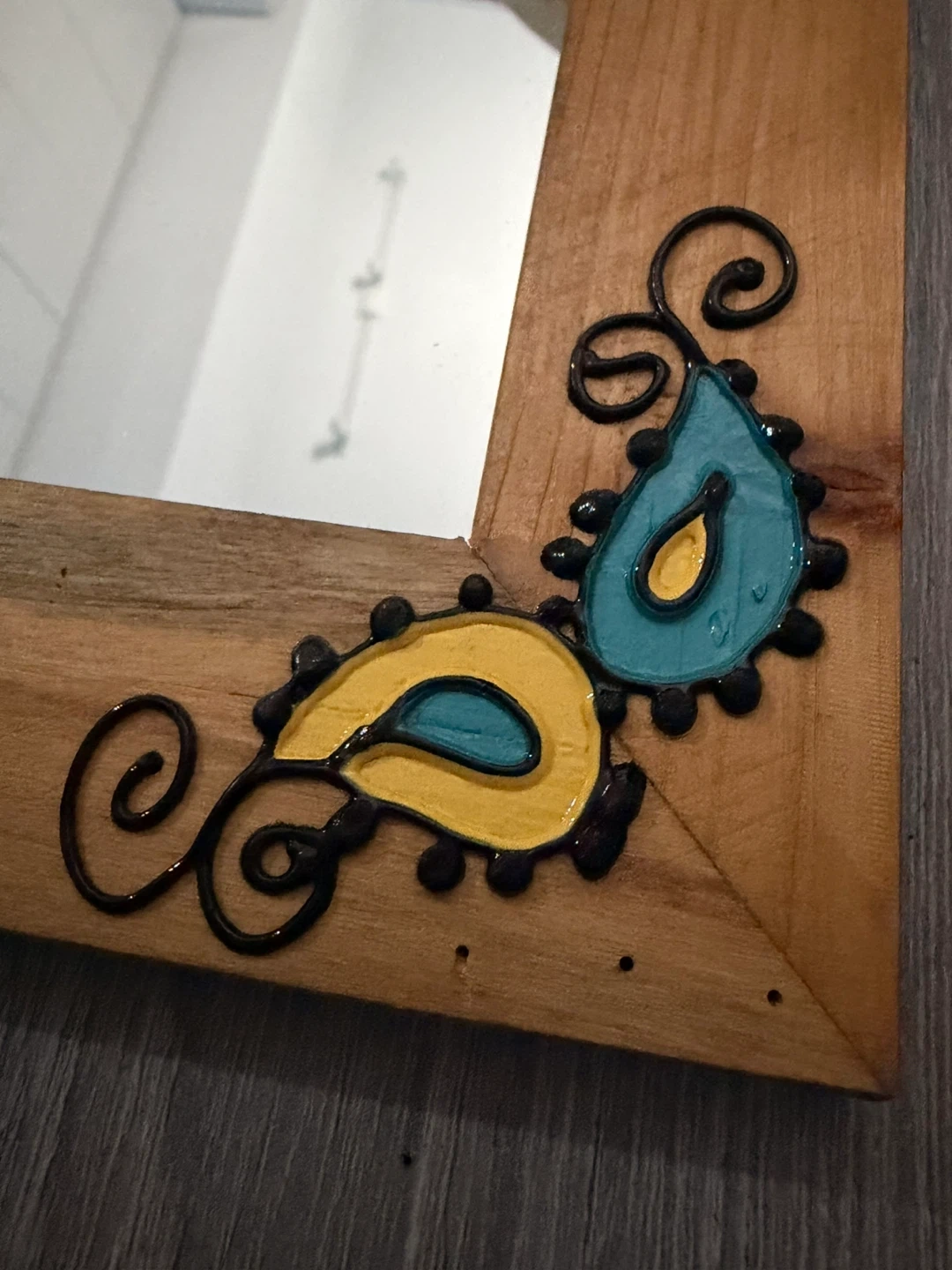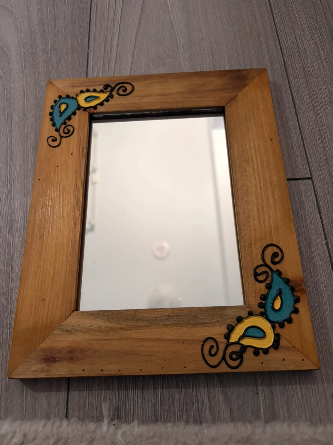 Check out this cute wooden-framed mirror! It features a unique hand-painted design in teal and yellow. Perfect for adding a touch of whimsy to any room
