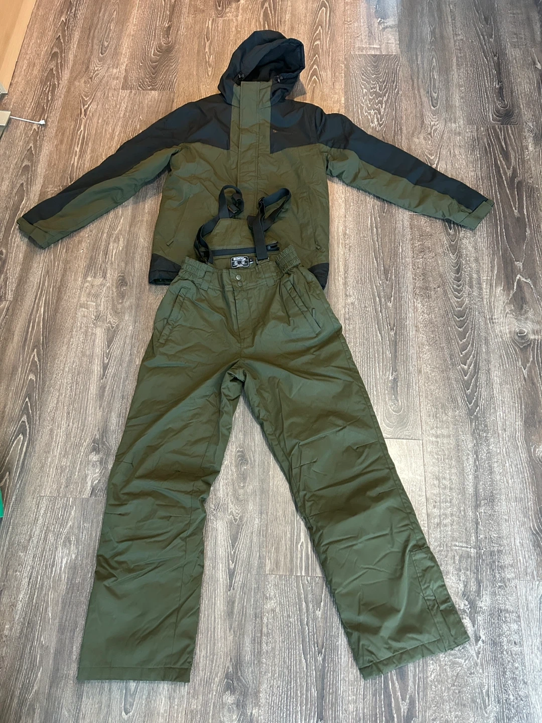 The set is in like new condition (wore once only) and perfect for staying warm and dry. The jacket features a hood and the pants have adjustable suspenders.