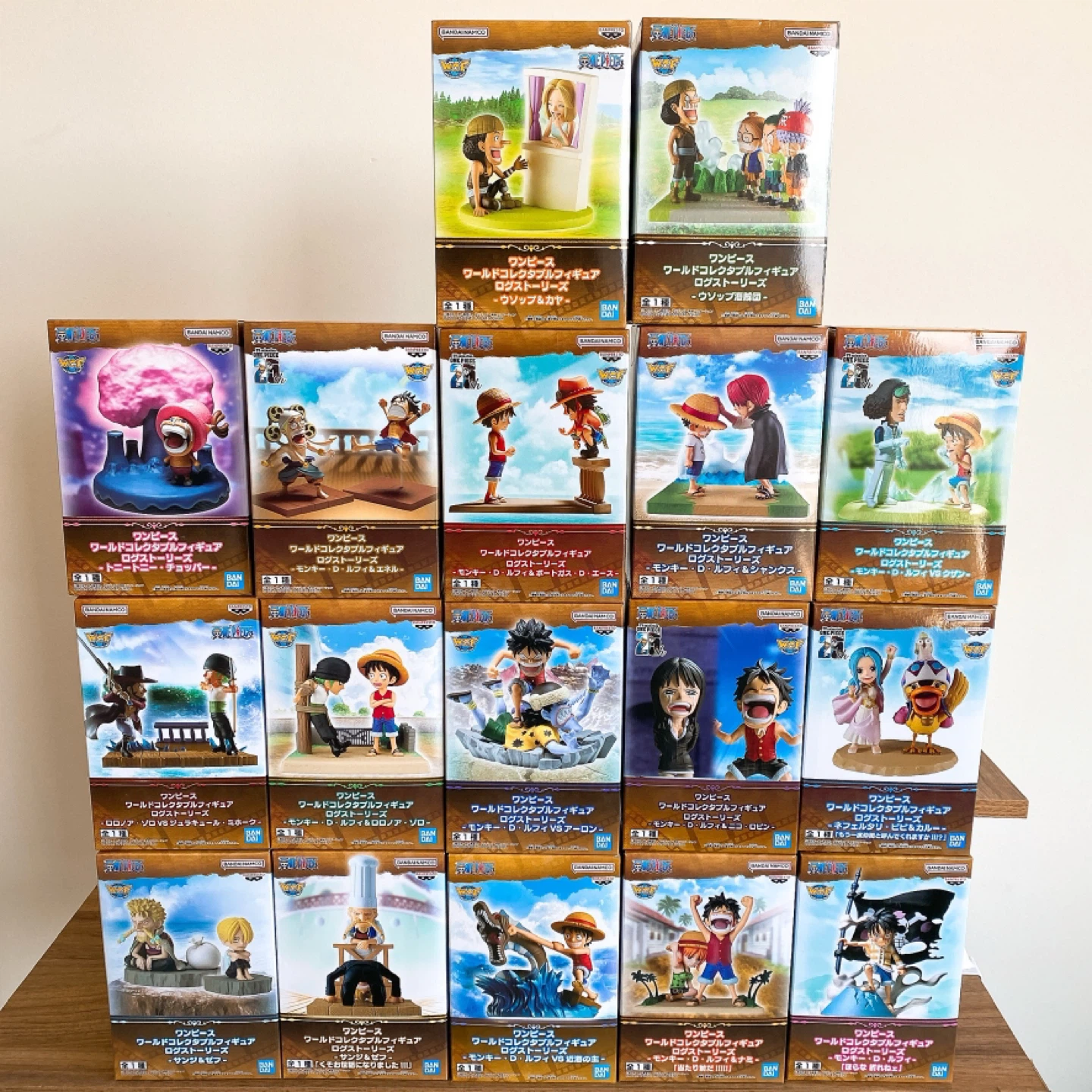 Here are some One Piece World Collectable Figures from the Log Stories series! They're all still in their boxes, ready for a new collector. Each figure captures a memorable moment from the series. A great addition to any One Piece fan's collection!