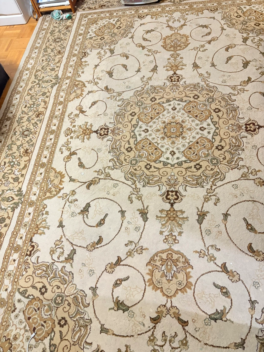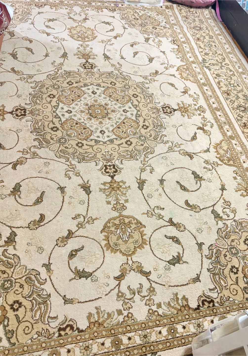 Selling a patterned area rug! It has a beautiful, intricate design in neutral tones, perfect for adding a touch of elegance to any room. It's in good condition and ready to be picked up few stains on it selling as it is