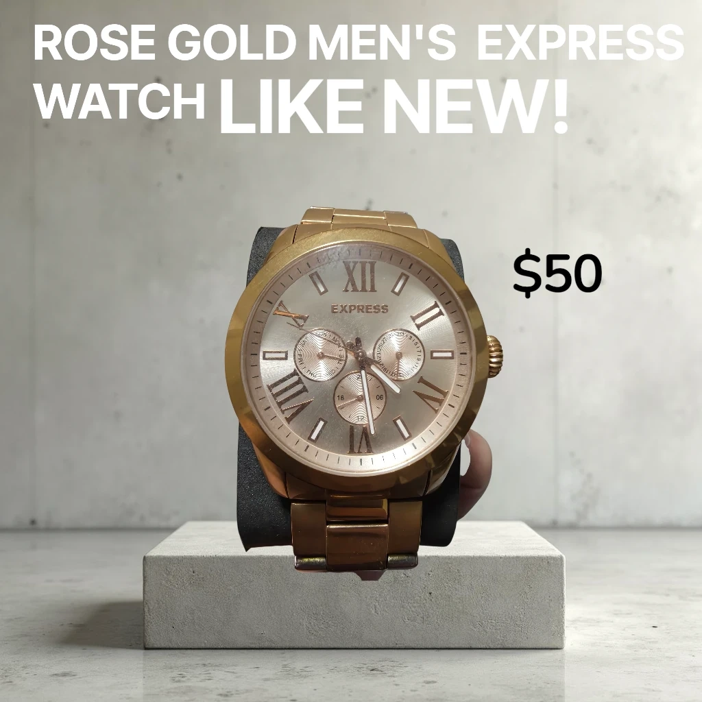 Selling a like-new Express rose gold men's watch. It's in excellent condition and ready to wear! You will not find this watch anywhere. It's a vintage and like new! I paid $200 at the time. Don't miss out on this opportunity.